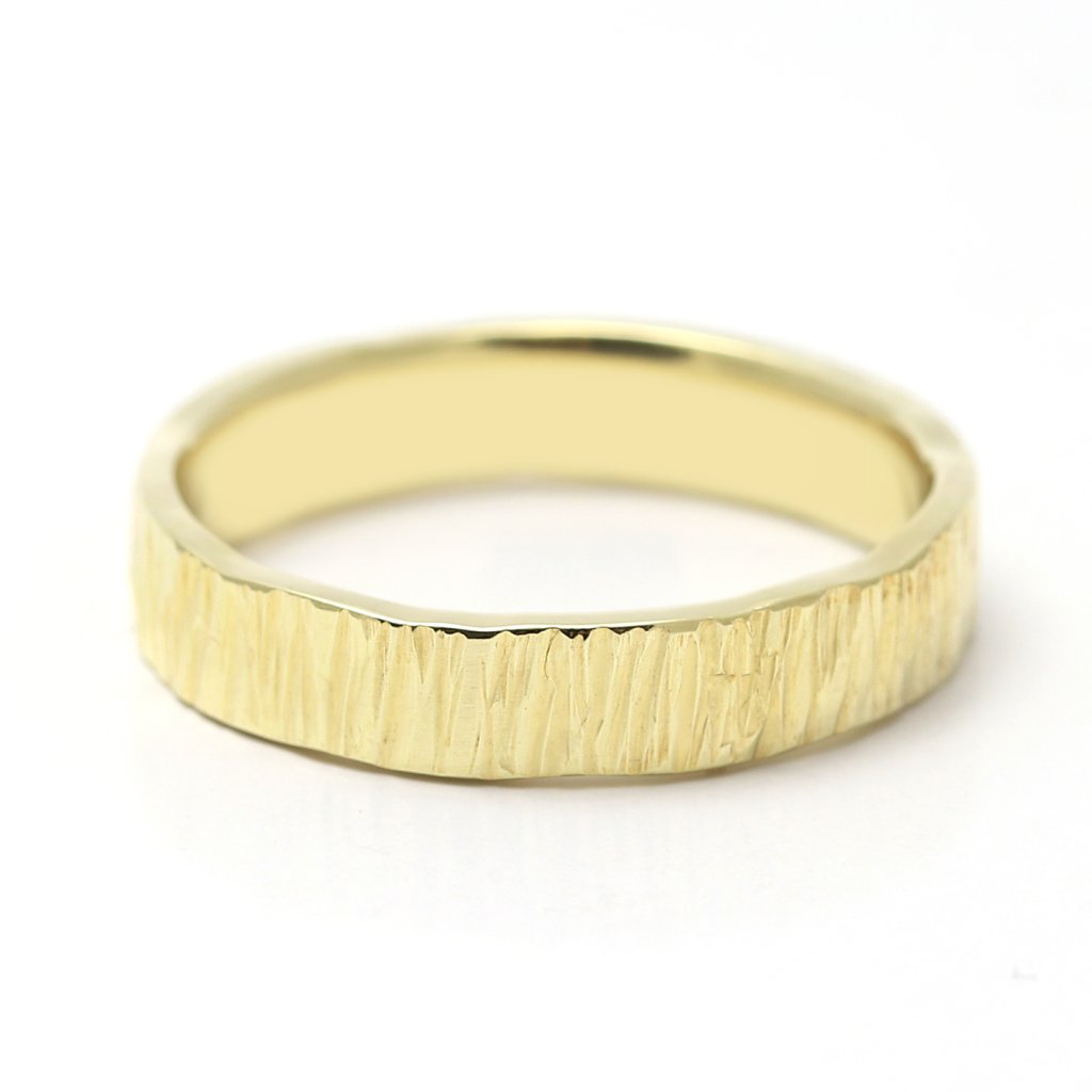 Pánský snubní prsten ze žlutého zlata s výraznou strukturou. Moderní, ručně zhotovený šperk s osobitým charakterem.