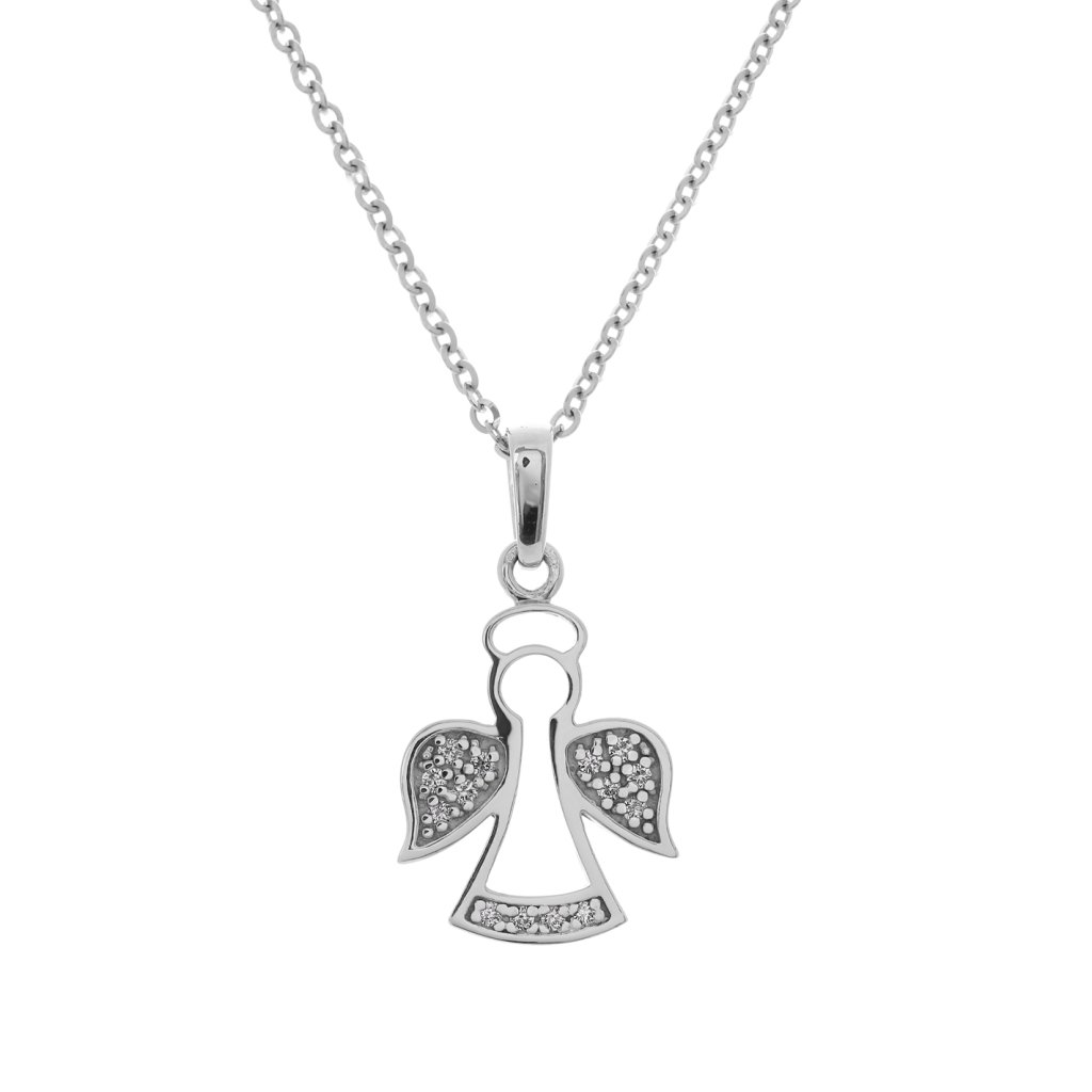 Jemný přívěsek ve tvaru anděla vyrobený z bílého zlata ryzosti 585/1000. Šperk je osázen čtrnácti kulatými brilianty o celkové hmotnosti 0,079 ct ve vzácně bílé barvě (F-G-H), čistotě SI1 a rozměrech ø 1,1–1,15 mm. Diamanty jsou precizně zasazeny tak, aby násobily jas bílého zlata a přívěsek v dekoltu krásně zářil i při svých drobných rozměrech.