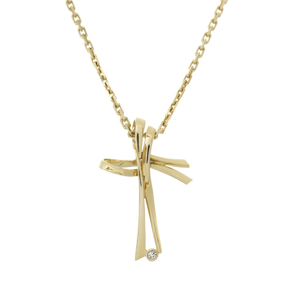Originální přívěsek ve tvaru křížku vyrobený ze žlutého zlata ryzosti 585/1000. Šperk je osázen jedním kulatým briliantem o hmotnosti 0,028 ct ve výjimečně bílé barvě +(F), průměru ø 1,85 mm, a čistotě SI1. Design se vyznačuje moderním vrstvením zlatých linií s vysokým leskem.