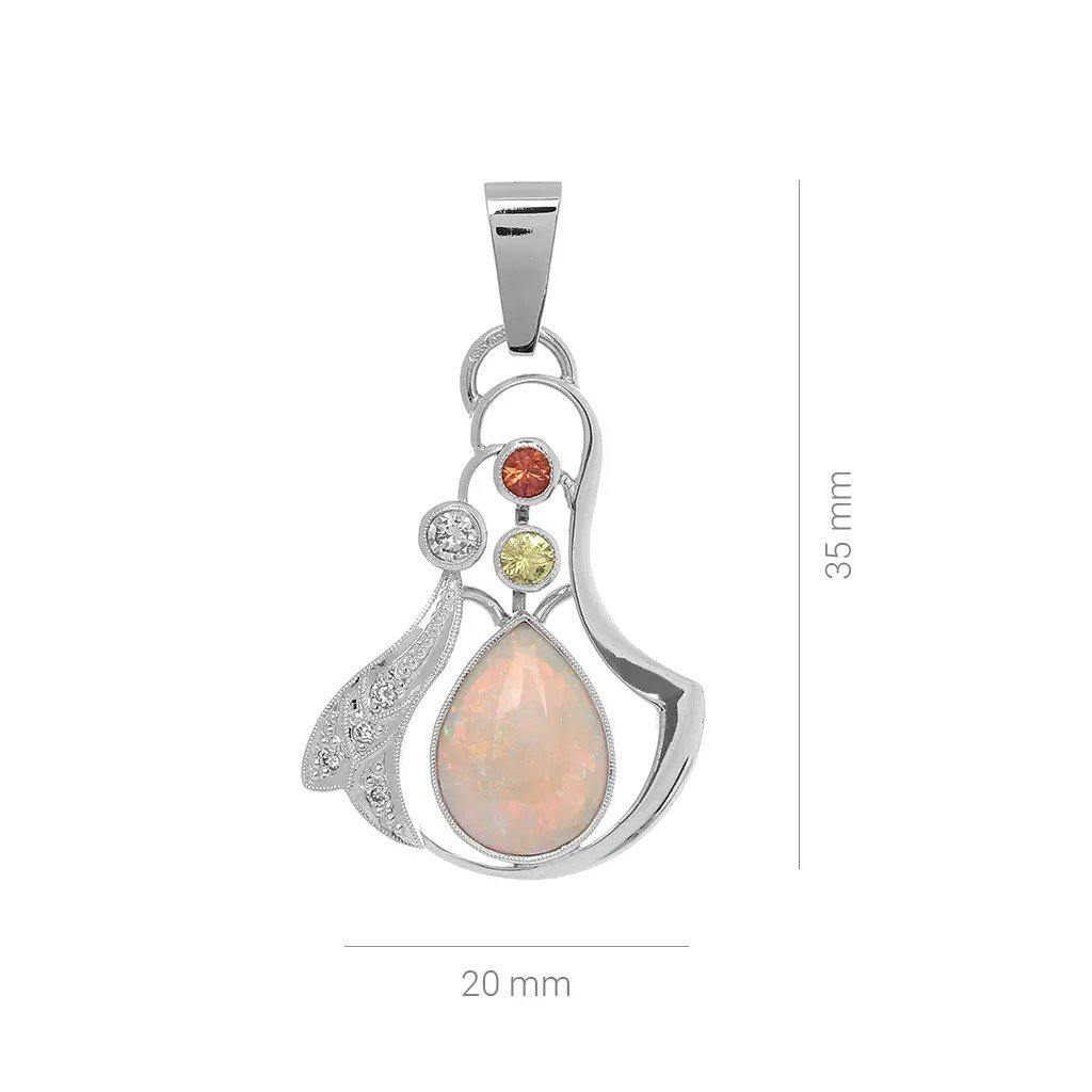 Tento ručně vyrobený přívěsek z bílého zlata je oslavou jemnosti barev a nadčasové elegance. Dominantním kamenem je opál v brusu pantlok kabašon o rozměru 10,45 × 7,8 × 2,85 mm a hmotnosti 1,705 ct, jehož translucentní záře přináší do šperku hru světla a jedinečnou hloubku. Šperk je doplněn dvěma kulatými fasetovanými safíry v odstínech žluté a oranžové, jejichž barva byla dodatečně upravena, každý o rozměru 2,45–2,7 mm a celkové hmotnosti 0,180 ct, které dodávají přívěsku sofistikovanou jiskru a elegantní kontrast.