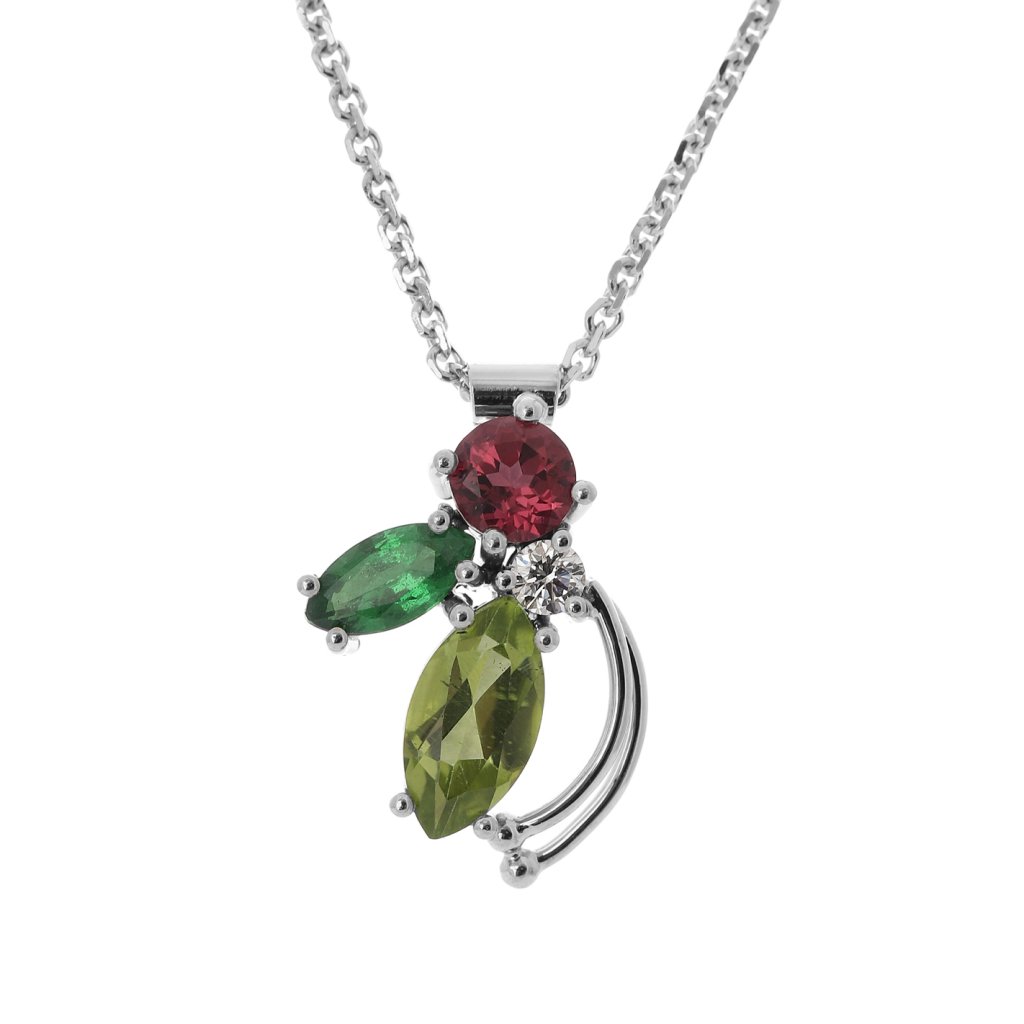 Elegantní přívěsek z bílého zlata 585/1000 zdobený přírodním almandinem, tsavoritem, peridotem a diamantem. Ruční výroba, precizní osazení a jedinečná barevná kompozice doplněná jemným řetízkem.