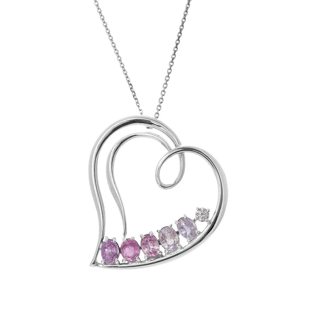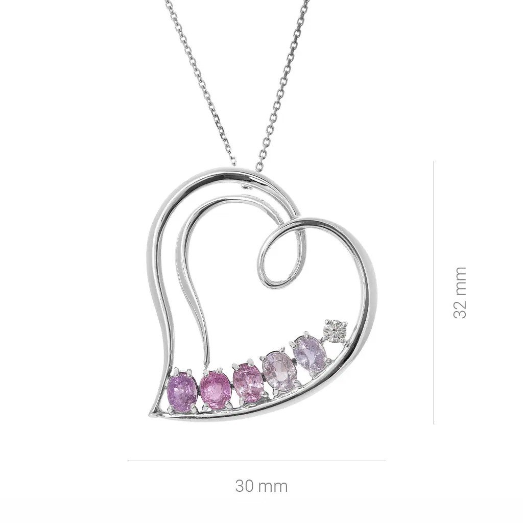 Vyjádřete svou lásku a eleganci s tímto nádherným přívěskem ve tvaru srdce z bílého zlata, který okouzlí kombinací barevných safírů a třpytu diamantů. Pět oválných safírů různých odstínů přináší šperku živost a jemnou hru barev, zatímco kulatý briliant bílé barvy (G) a vysoké čistoty VS dodává třpyt a sofistikovaný luxusní efekt. Přívěsek je vyroben z kvalitního bílého zlata ryzosti 585/1000 s čistou hmotností 4,04 g, což zajišťuje jeho nadčasovou hodnotu a odolnost.