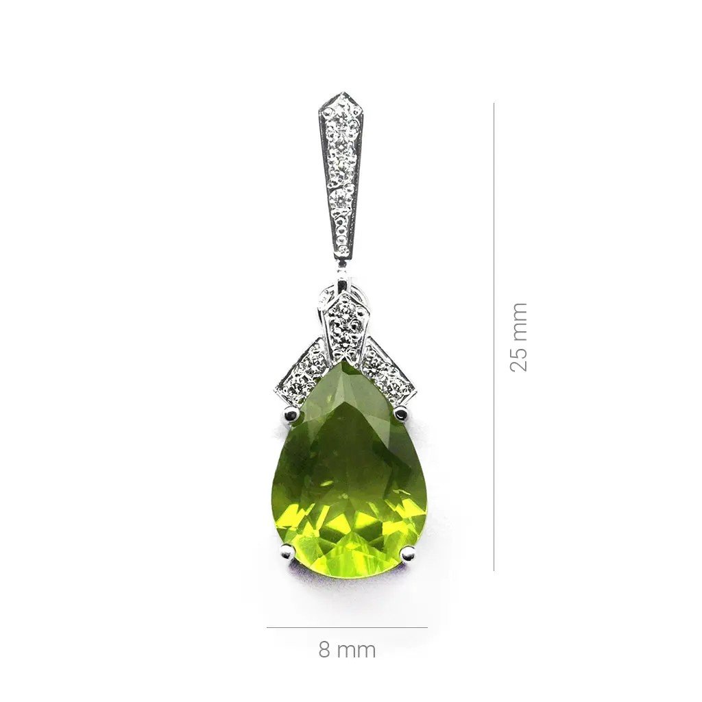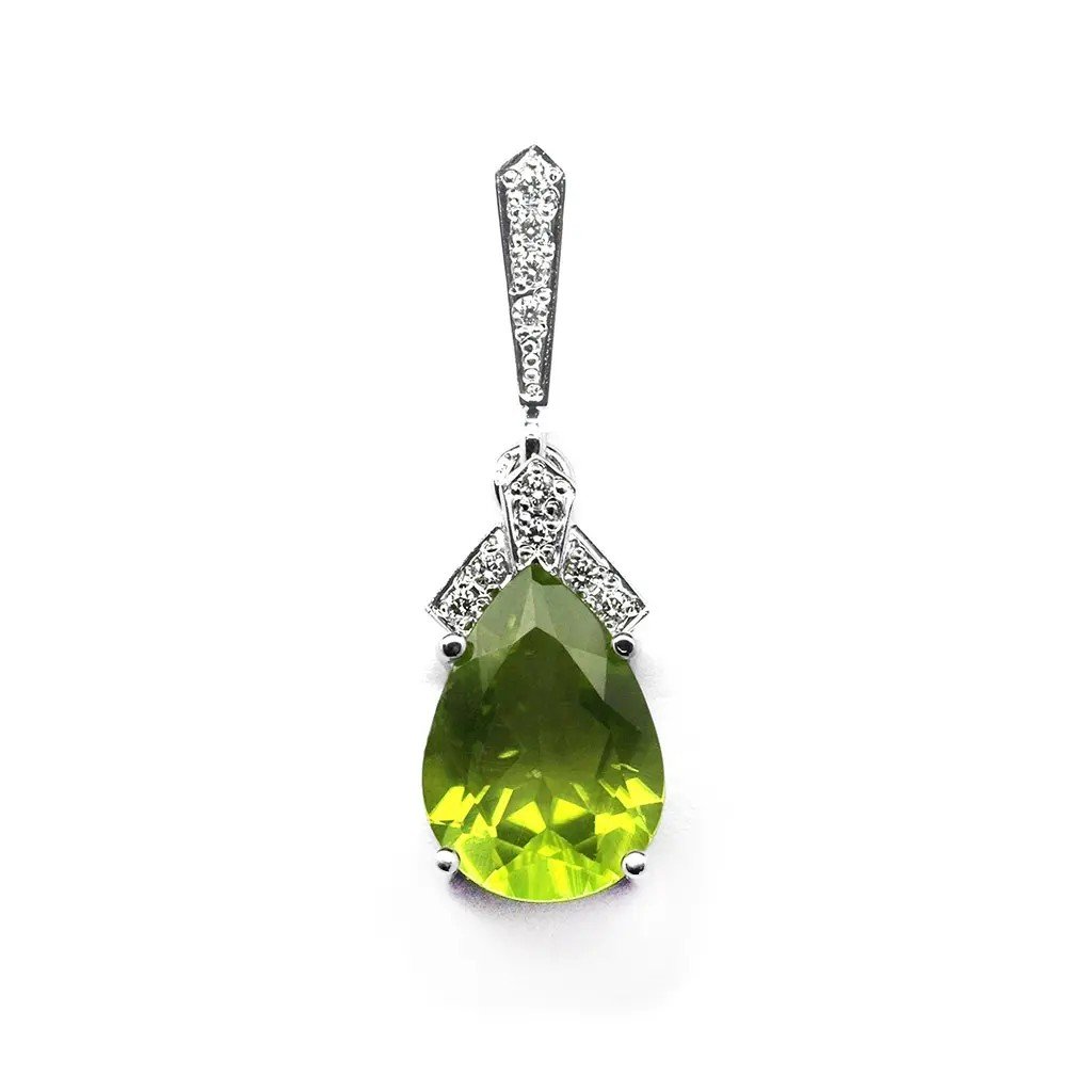 Přívěsek ve tvaru kapky s olivínem a diamanty z bílého zlata