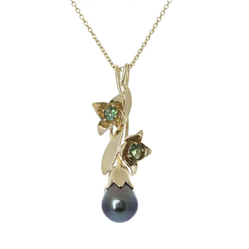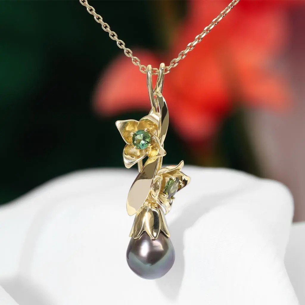 Ručně vyrobený květinový přívěsek ze žlutého zlata s turmalíny a perlou Tahiti – šperk plný barev, jemnosti a luxusu.