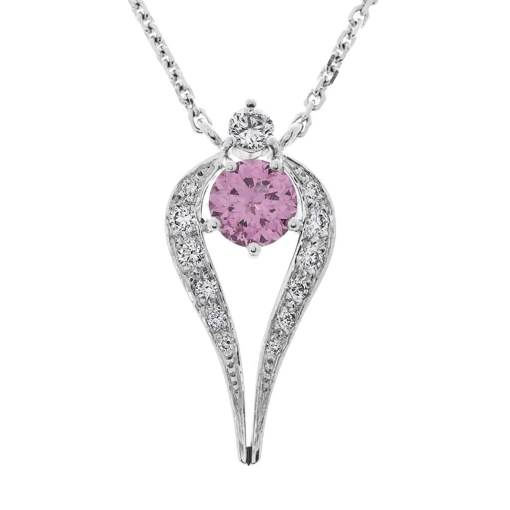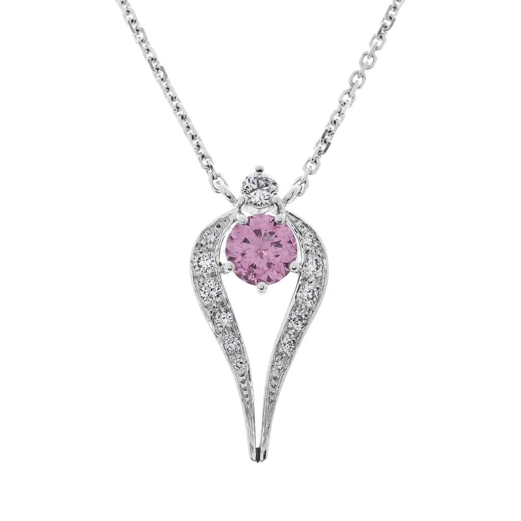 Tento přívěsek z bílého zlata (Au 585/1000, 3,44 g) kombinuje precizní ruční práci s nadčasovou elegancí. Střed šperku tvoří kulatý fasetovaný spinel o průměru 5,05 mm a hmotnosti 0,478 ct, načervenale purpurový a transparentní, jehož sytá barva přitahuje pohled a dodává šperku jedinečný charakter.