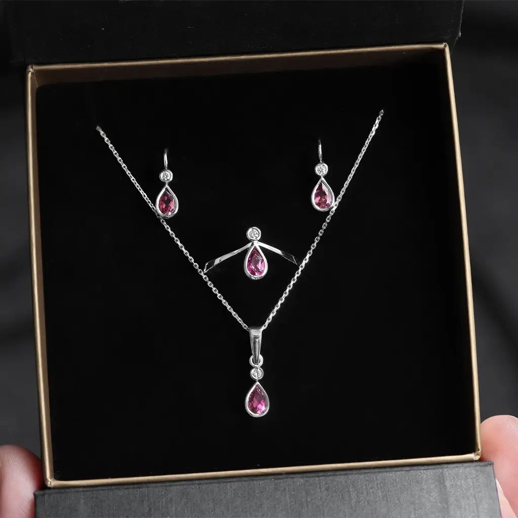 Tento přívěsek z bílého zlata (Au 585/1000, 0,77 g) je symbolem jemné elegance a nadčasové krásy. Střed šperku tvoří pantlok fasetovaný turmalín o rozměru ~6×4 mm a hmotnosti 0,484 ct, načervenale purpurový a transparentní, jehož intenzivní barva přitahuje pohled a dodává šperku živý a sofistikovaný vzhled.