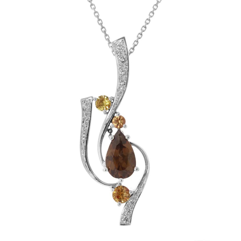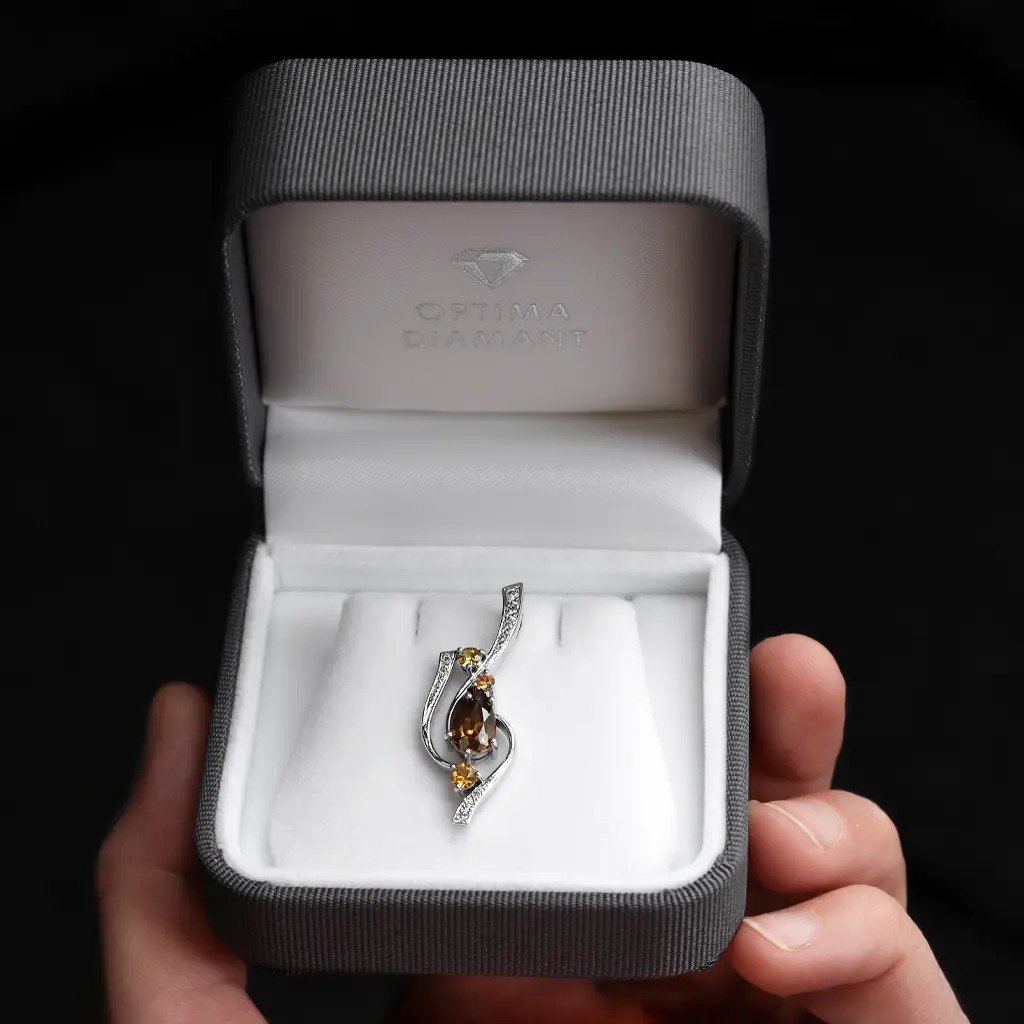 Tento přívěsek z bílého zlata (Au 585/1000, 3,21 g) je oslavou barev a jemného třpytu. Střed šperku tvoří pantlok fasetovaný zirkon o rozměru 9,3×5,7×4,3 mm a hmotnosti 1,977 ct, nažloutle hnědý a transparentní, jehož barva dodává šperku hloubku a sofistikovaný charakter.