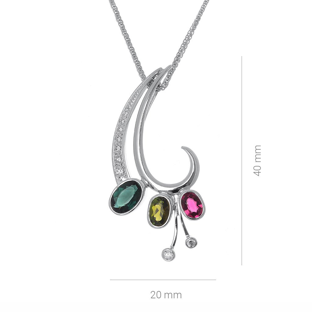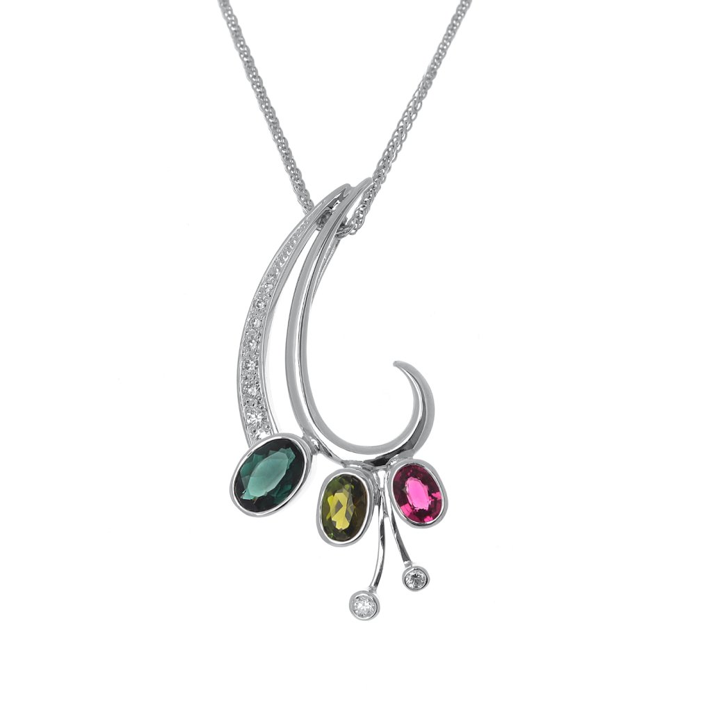 Elegantní přívěsek z bílého zlata 585/1000 zdobený třemi přírodními turmalíny v jemných odstínech a devíti brilianty. Umělecký design, barevná harmonie a luxusní třpyt.