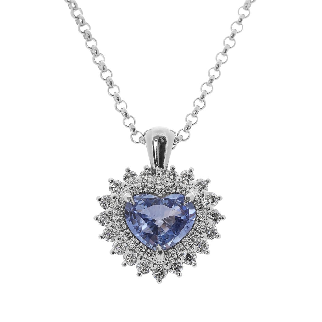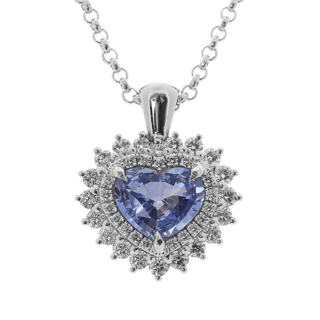 Elegantní přívěsek z bílého zlata 585/1000 zdobený přírodním modrým safírem ve tvaru srdce a 39 brilantními diamanty. Luxusní ruční výroba, výrazná brilance a nadčasový design.