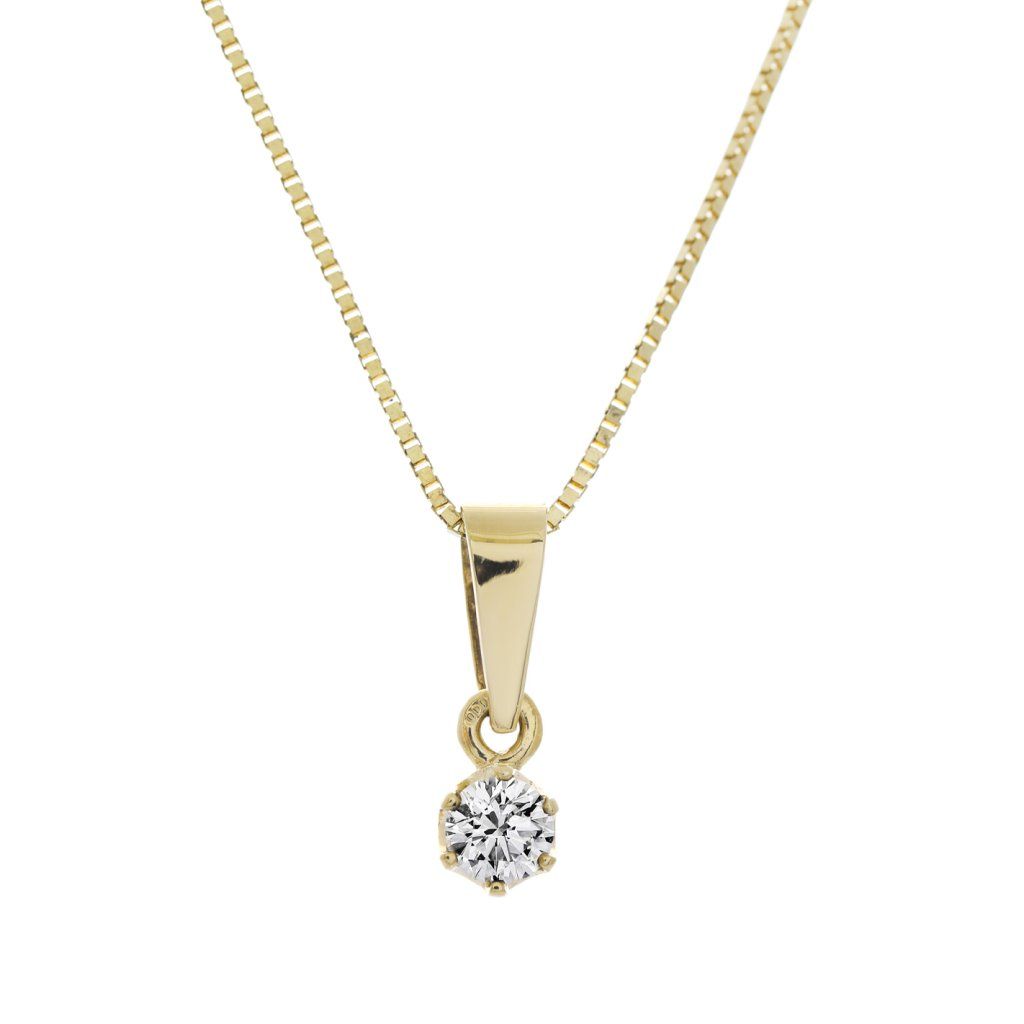 Decentní přívěsek ze žlutého zlata ryzosti 585/1000 vyniká svým precizním zpracováním, které dává plně vyniknout kráse drahého kamene. Šperku dominuje přírodní diamant v kulatém briliantovém brusu o průměru 3,6 mm a hmotnosti 0,176 ct. Kámen má čistotu VS a lehce tónovanou bílou barvu J, která ve spojení se žlutým zlatem vytváří velmi příjemný a jiskřivý vizuální dojem. Čistá váha žlutého zlata v přívěsku je 0,40 g a celková hmotnost celého kusu činí 0,44 g.