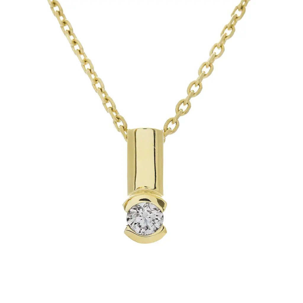 Něžný přívěsek ze žlutého zlata s kulatým diamantem – symbol elegance a nadčasové krásy. Lze doplnit náušnicemi a prstenem do harmonického setu.