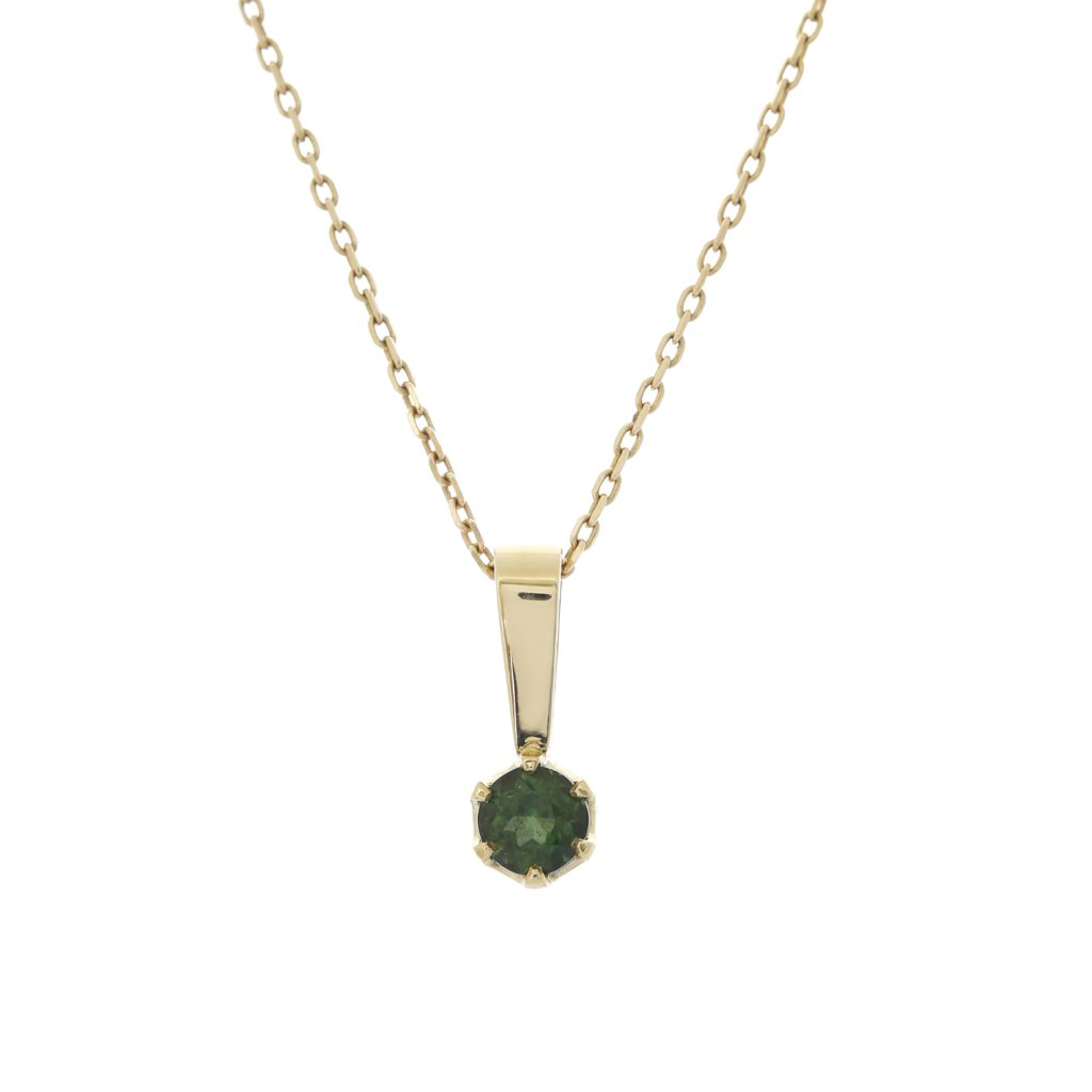 Elegantní přívěsek vyrobený ze žlutého zlata ryzosti 585/1000. Šperku dominuje přírodní turmalín o hmotnosti 0,212 ct v kulatém fasetovaném brusu, který vyniká svou transparentností a specifickým, lehce nažloutle zeleným odstínem. Průměr drahokamu je 3,65 mm, což z přívěsku dělá decentní, ale nepřehlédnutelný doplněk.