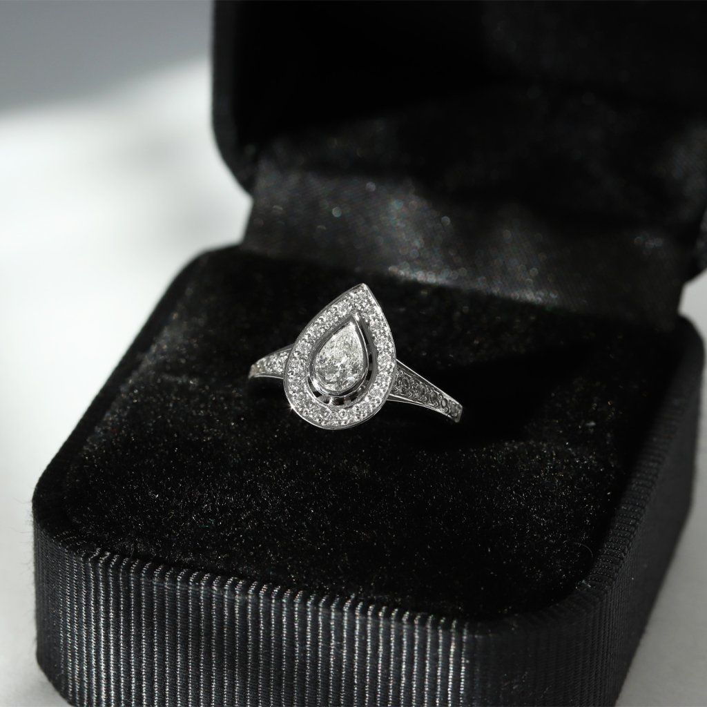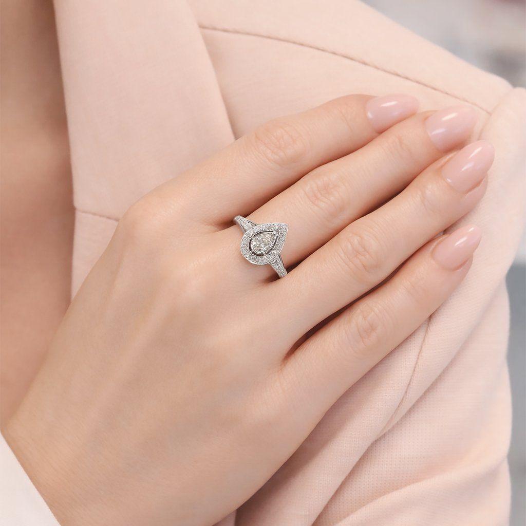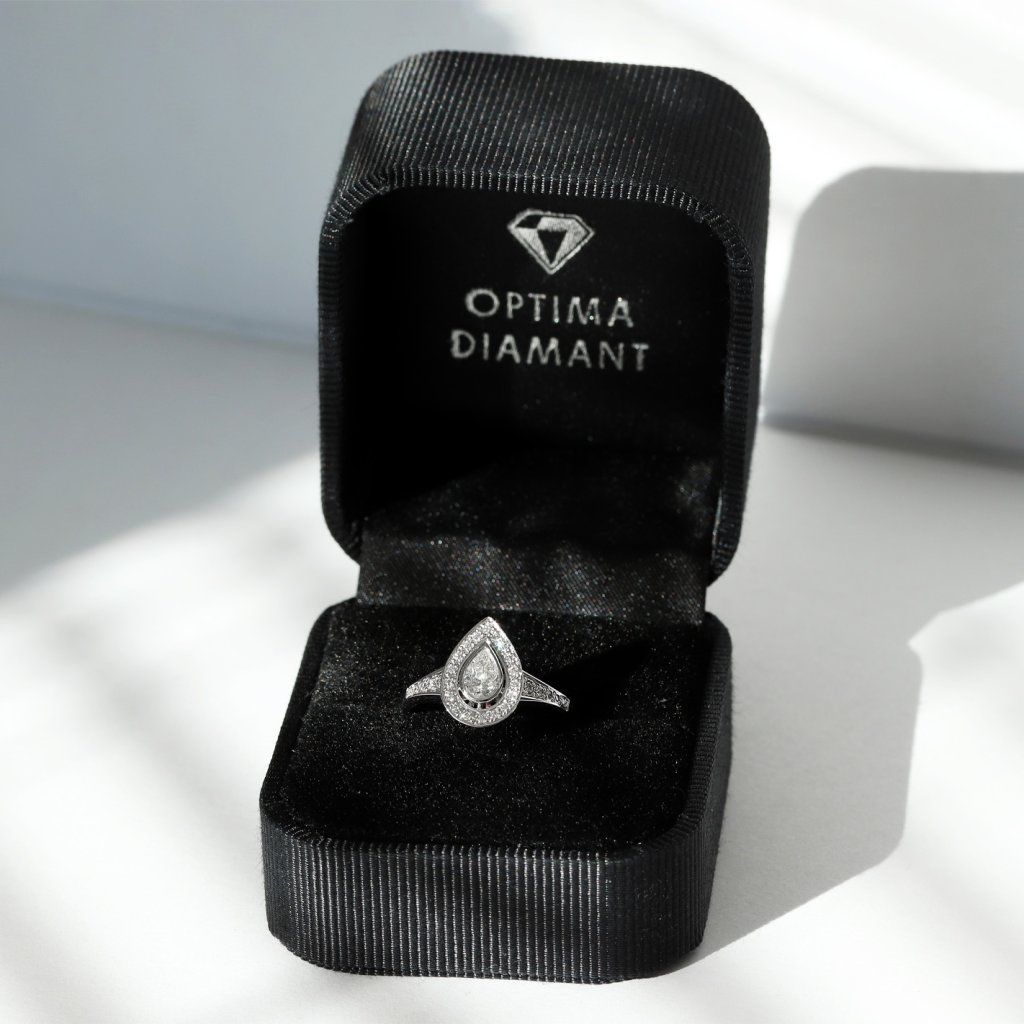 Jemný prsten z bílého zlata s diamantovou kapkou o váze 0,37 ct, obklopenou 28 třpytivými diamanty. Symbol lásky a elegance, který ozdobí každý významný okamžik a zůstane klenotem pro celé generace.