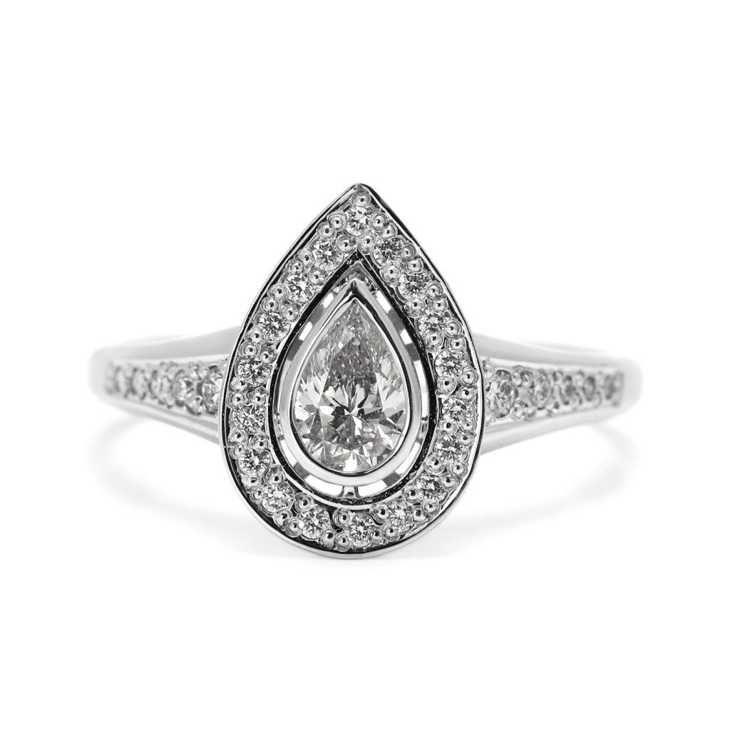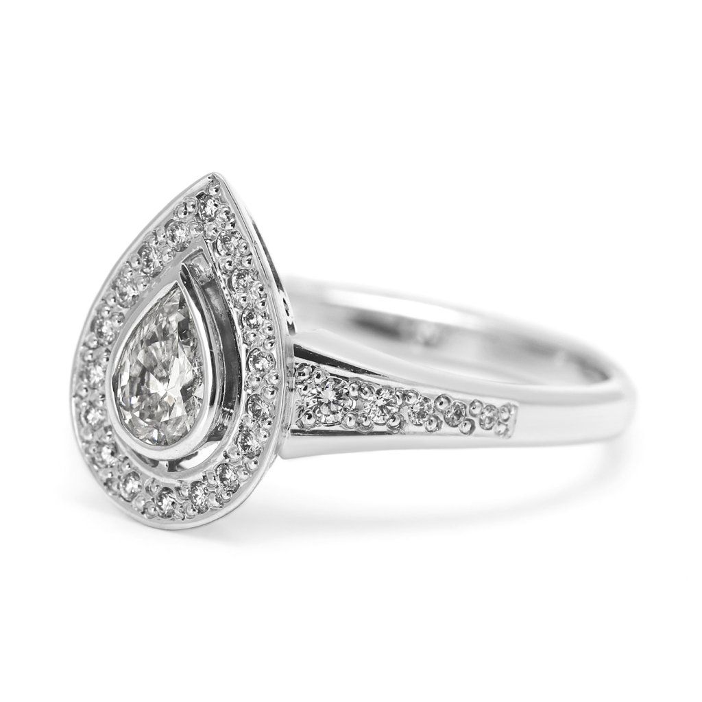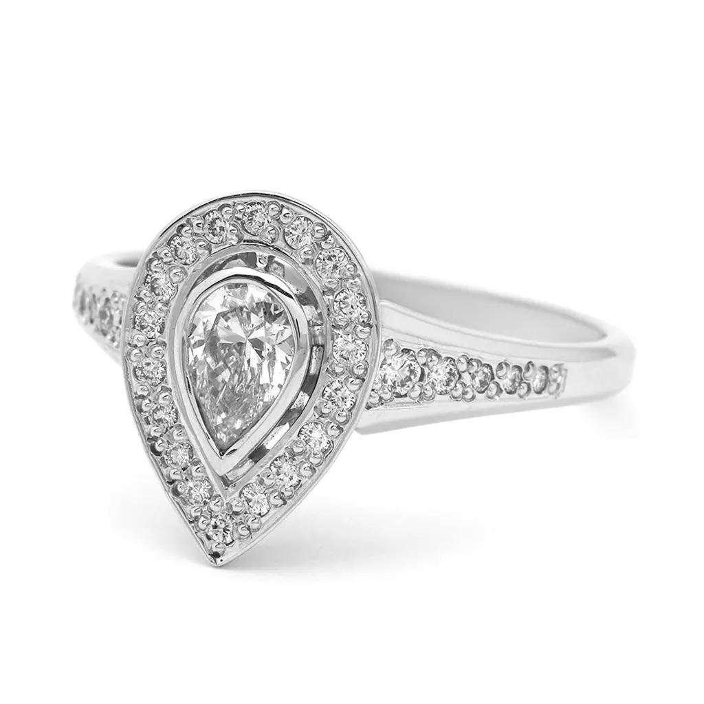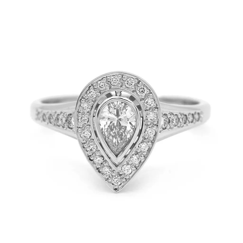 Jemný prsten z bílého zlata s diamantovou kapkou o váze 0,37 ct, obklopenou 28 třpytivými diamanty. Symbol lásky a elegance, který ozdobí každý významný okamžik a zůstane klenotem pro celé generace.