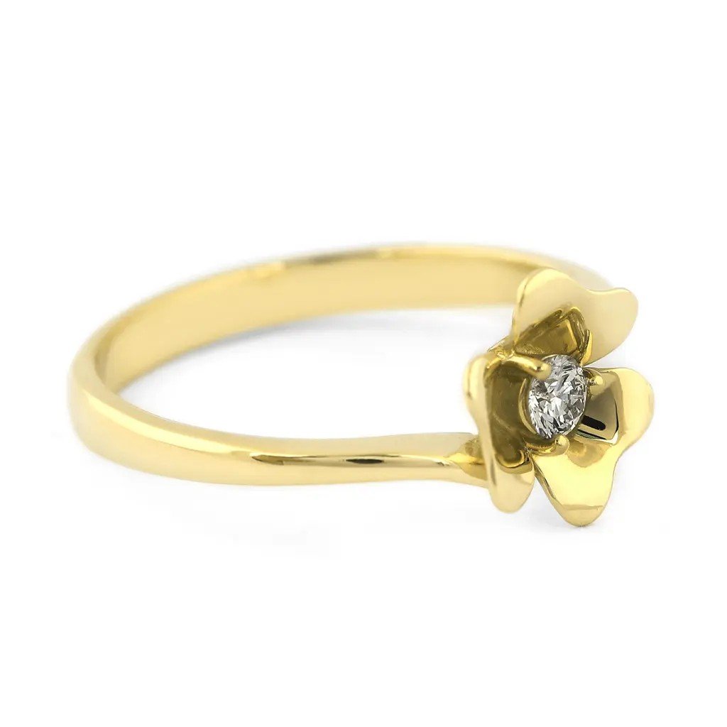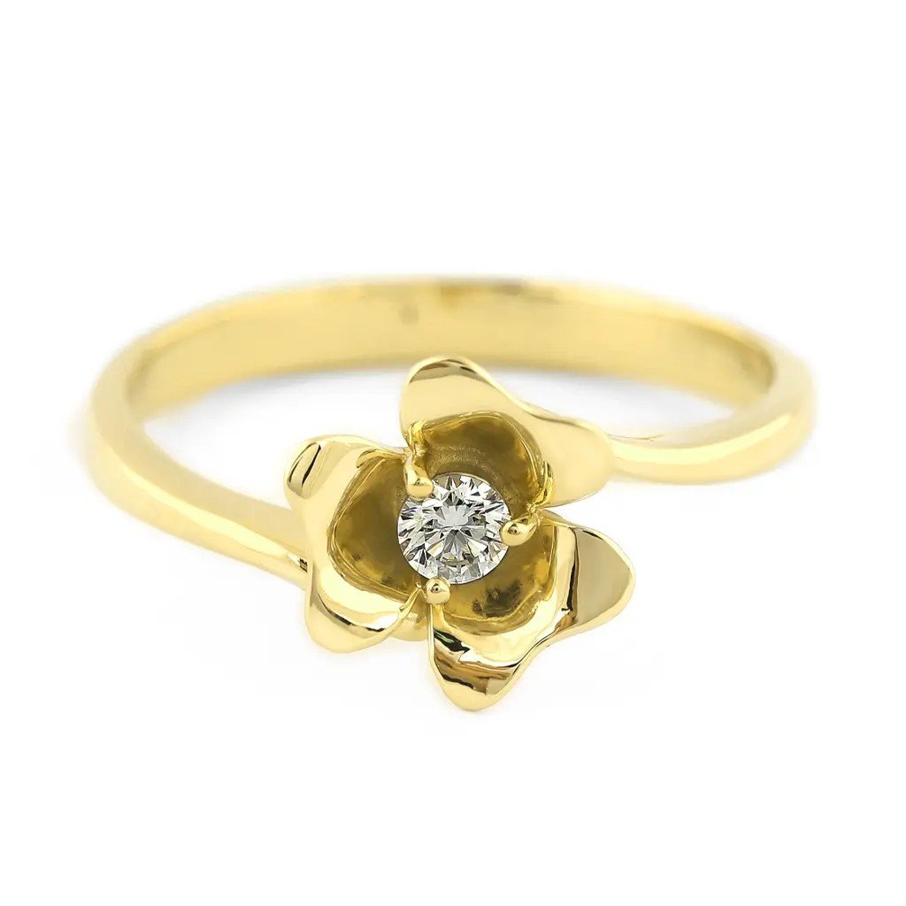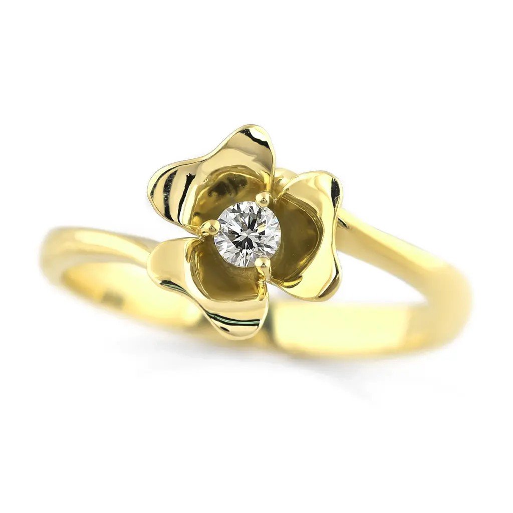 Okouzlující prsten ze žlutého zlata ve tvaru růže s přírodním diamantem, který přináší jemný třpyt a romantickou eleganci. Perfektní šperk jako dárek nebo pro radost.