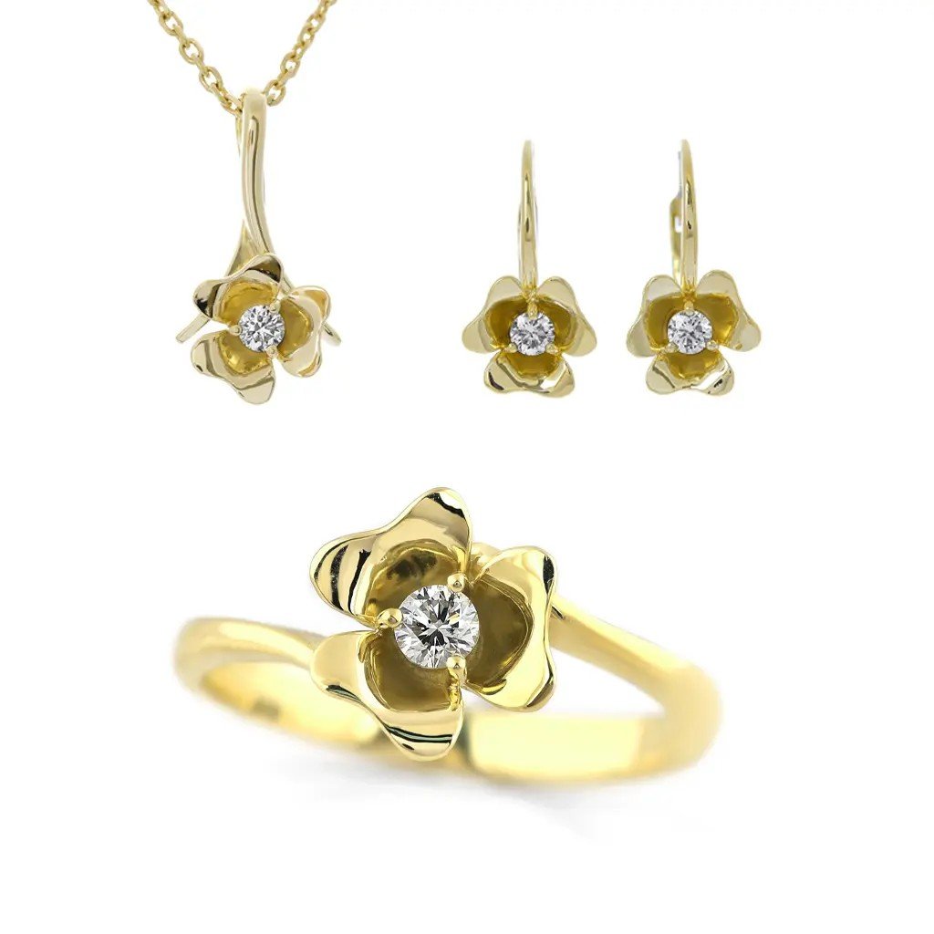 Tento nádherný prsten ze žlutého zlata je inspirován jemnou krásou květu růže. Centrálním kamenem je přírodní, vzácně bílý diamant tónovaný (L) s kulatým briliantovým brusem o průměru 2,95 milimetru a hmotnosti 0,103 karátu. Každý okvětní lístek prstenu je ručně tvarován zlatníky s maximální precizností, což zajišťuje, že každý vyrobený šperk je originál stejně jako samotné květiny. Diamant se ve žlutých lístcích nádherně odráží a vytváří jemné třpytivé odlesky, které dodávají šperku kouzlo a sofistikovanost.
