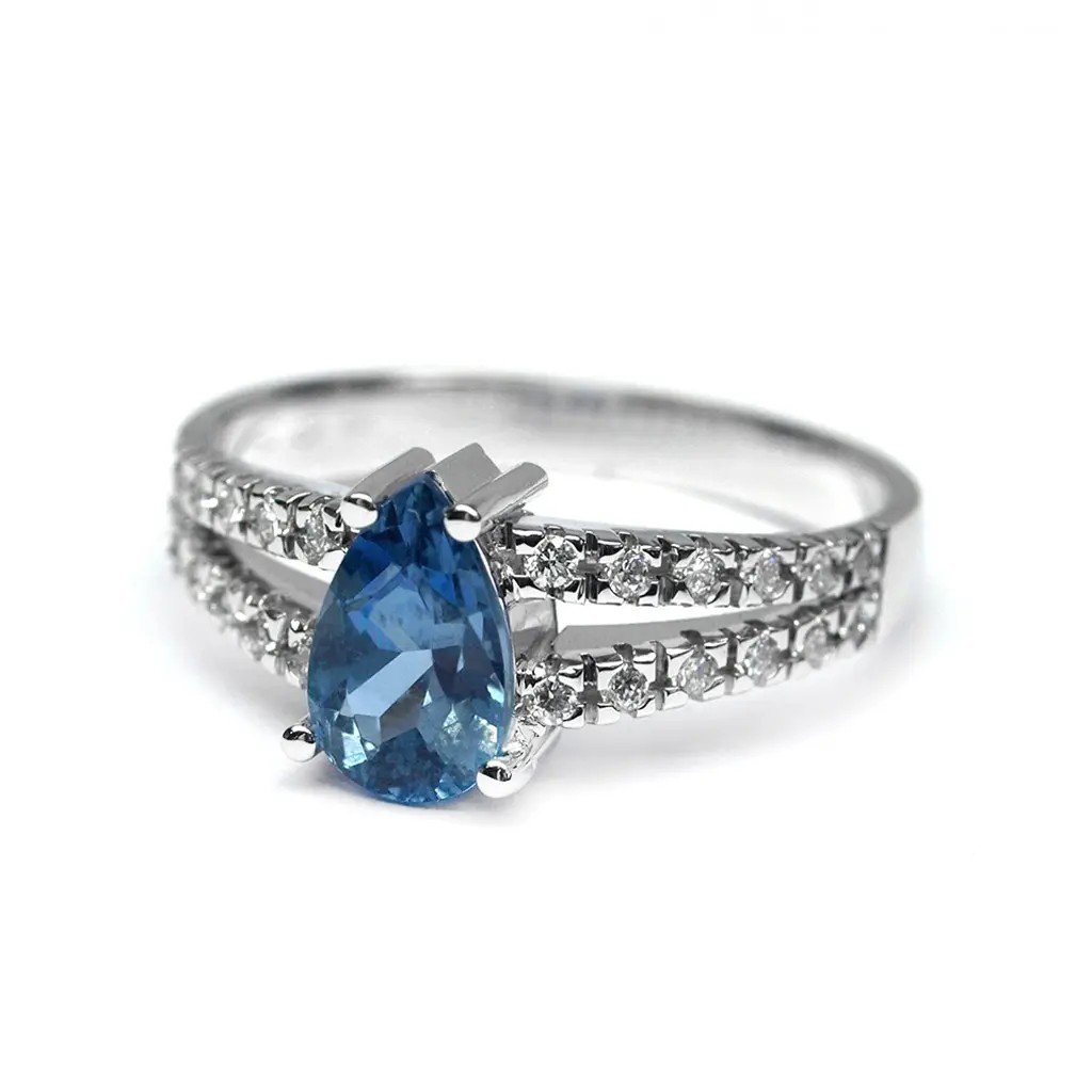Ručně vyrobený prsten z bílého zlata, který v sobě spojuje eleganci a kouzlo přírody. Dominantou šperku je přírodní brazilský akvamarín ve tvaru kapky, nazelenale modrý a transparentní, o rozměrech 8,1 × 5,1 × 4,25 mm a hmotnosti 0,886 ct. Tento kámen, známý jako symbol odvahy a naděje, přináší pocit klidu a spokojenosti, zároveň jemně podporuje zdraví a vitalitu.