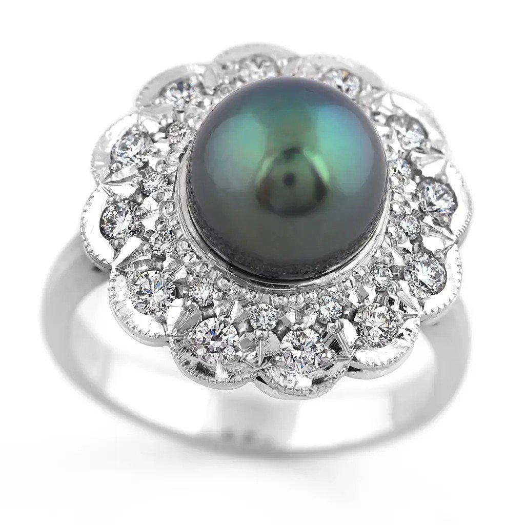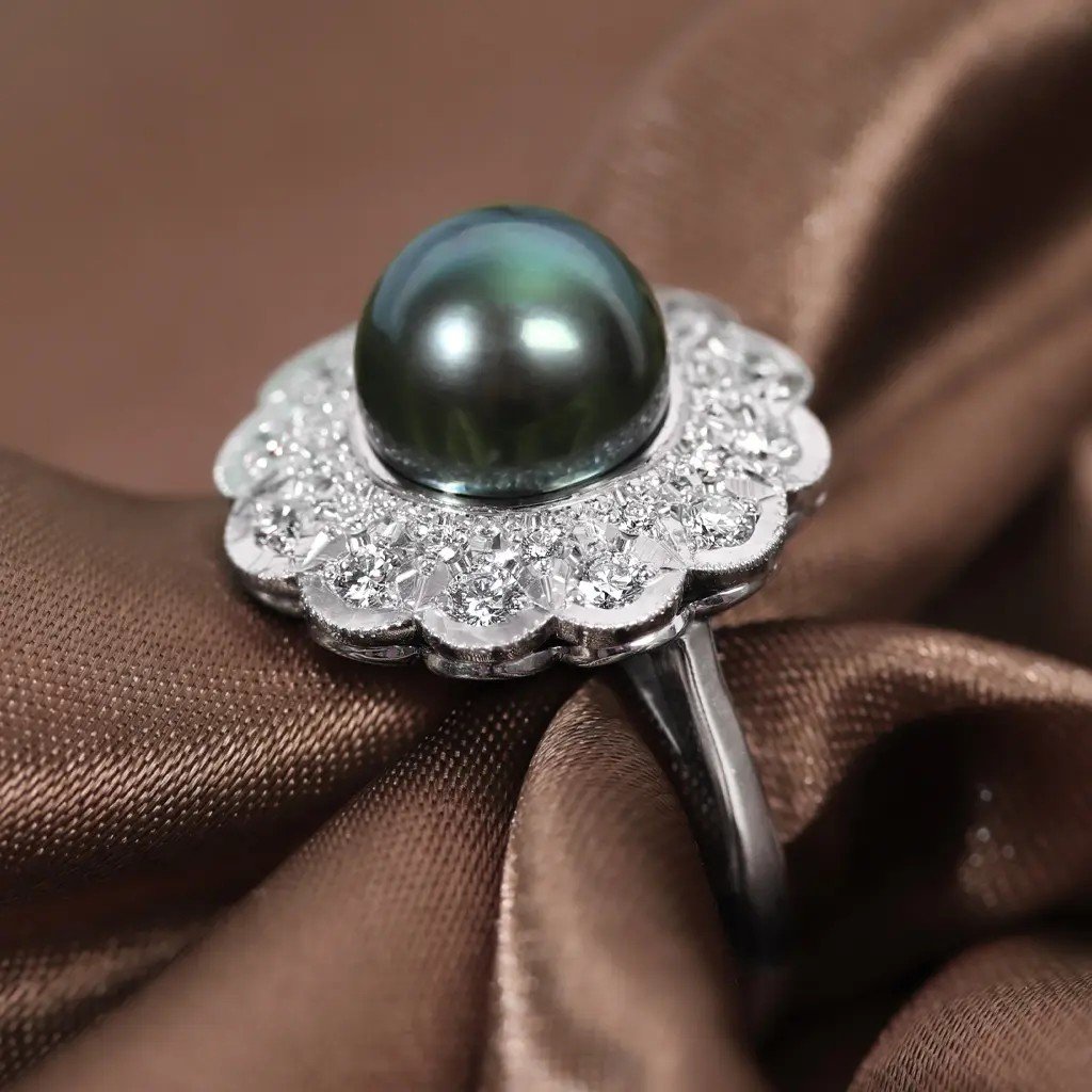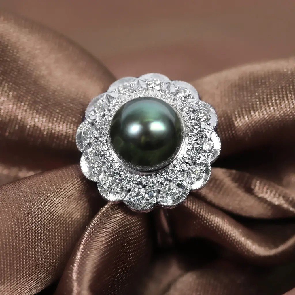 V naší klenotnické dílně vznikl jedinečný prsten z bílého zlata, který je dokonalou kombinací vzácné přírodní krásy a precizního řemeslného umění. Dominantou šperku je kultivovaná mořská perla Tahiti v elegantním tmavě šedo-zeleném odstínu, o průměru 9,3 × 9,9 mm a hmotnosti 5,792 ct. Tento exkluzivní klenot působí majestátně a stává se okamžitě nepřehlédnutelným středem celého prstenu.