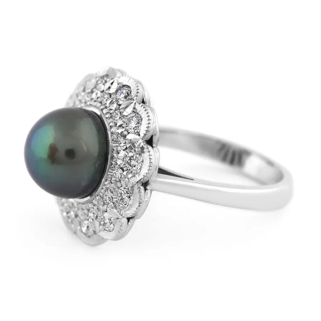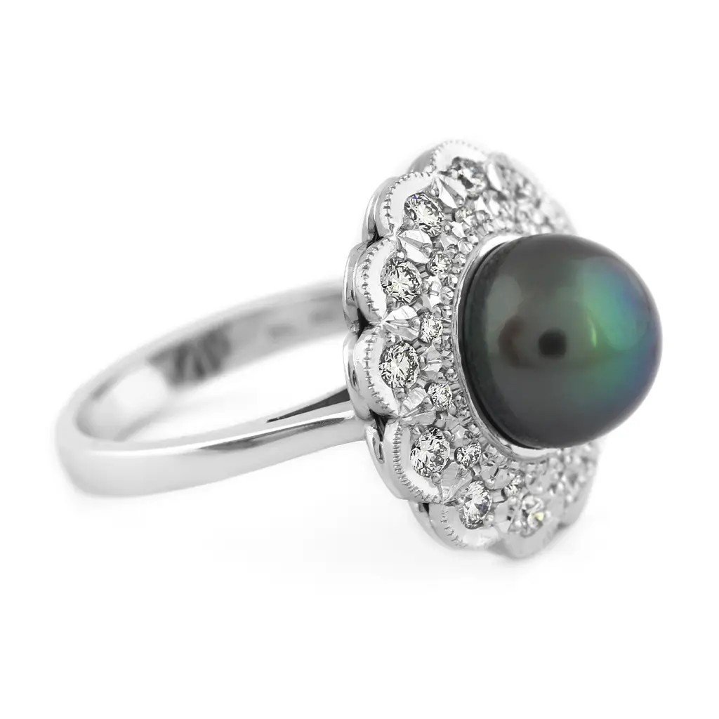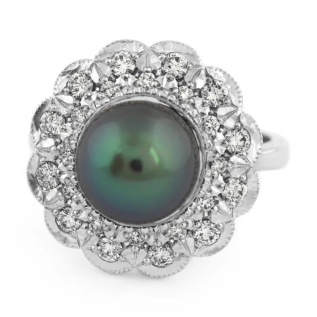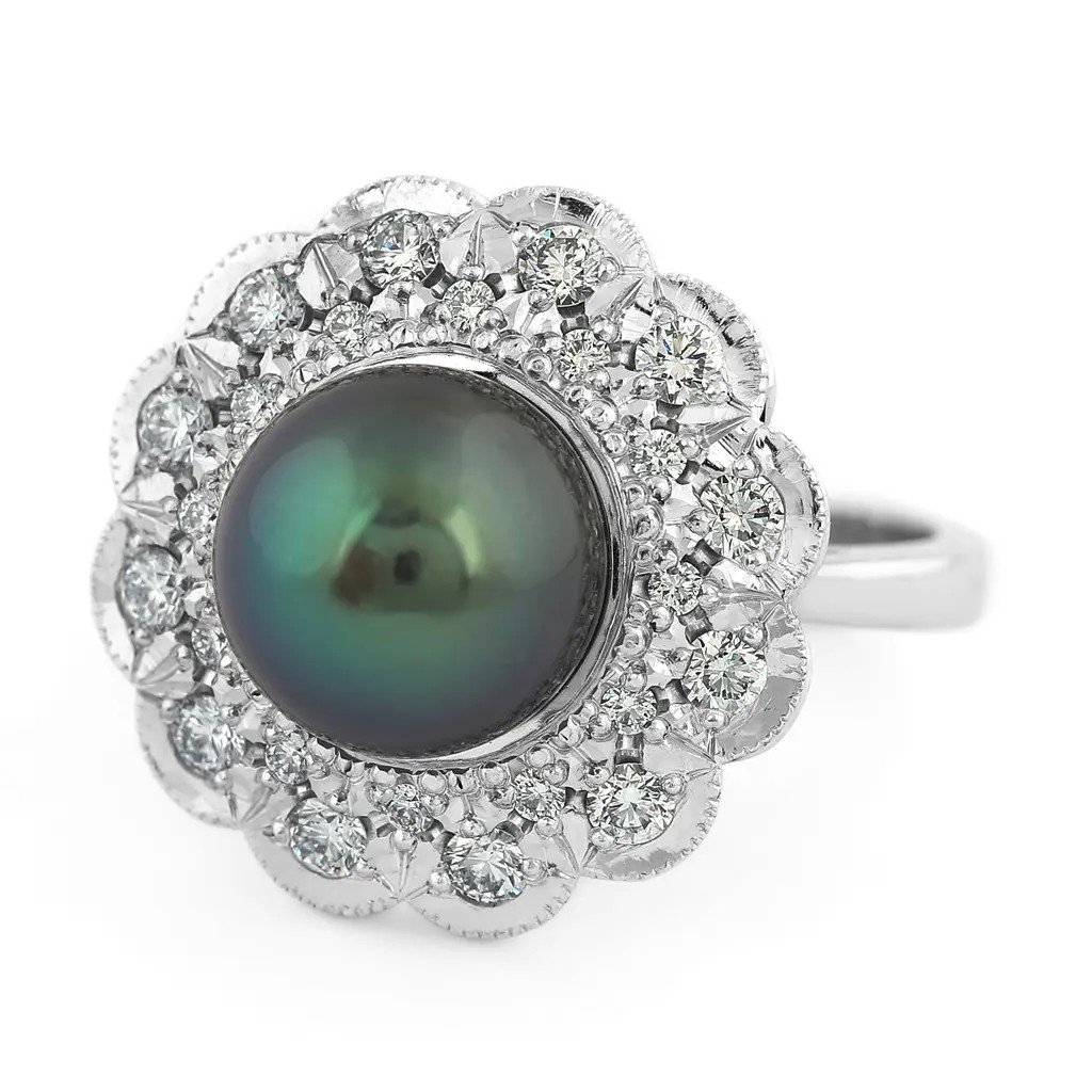 V naší klenotnické dílně vznikl jedinečný prsten z bílého zlata, který je dokonalou kombinací vzácné přírodní krásy a precizního řemeslného umění. Dominantou šperku je kultivovaná mořská perla Tahiti v elegantním tmavě šedo-zeleném odstínu, o průměru 9,3 × 9,9 mm a hmotnosti 5,792 ct. Tento exkluzivní klenot působí majestátně a stává se okamžitě nepřehlédnutelným středem celého prstenu.