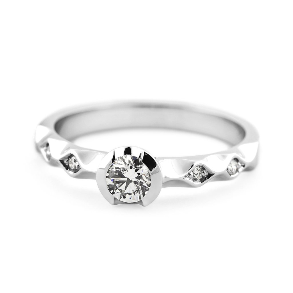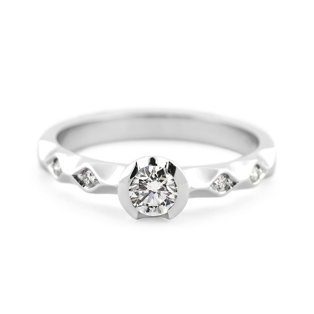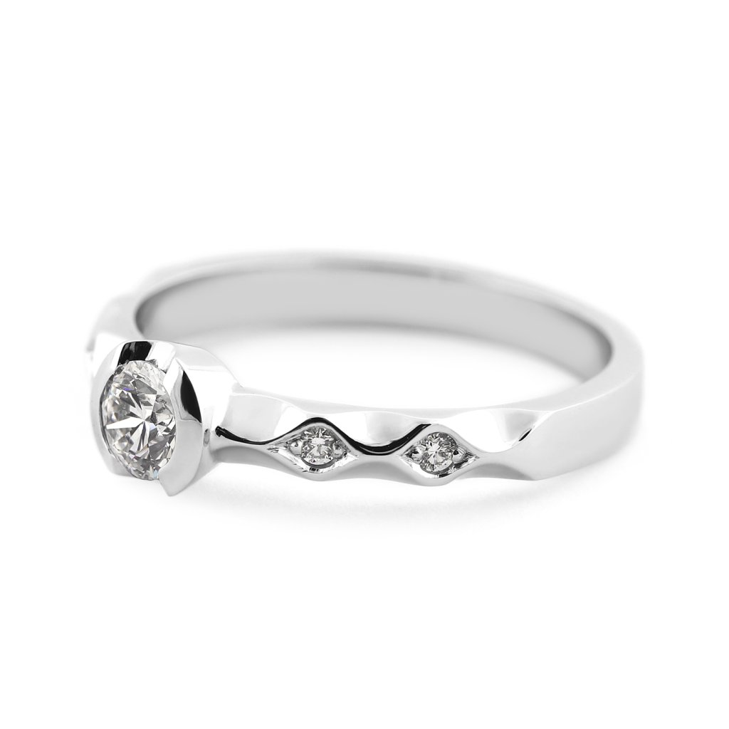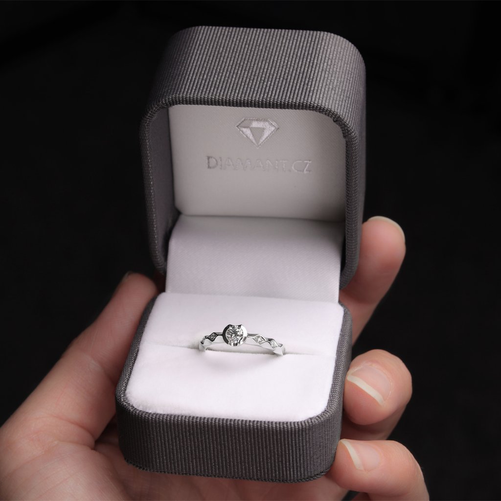 Tento prsten z bílého zlata ryzosti 585/1000 je osazen pěti přírodními diamanty kulatého briliantového brusu. Hlavní dominantou je centrální briliant o hmotnosti 0,280 ct, který doplňují čtyři menší diamanty o celkové hmotnosti 0,044 ct. Všechny použité kameny spadají do kategorie výjimečně bílých (D-E-F) s čistotou VS, což zajišťuje jejich vysoký jas. Design prstenu je charakteristický svým členěním v šíně, kde jsou vedlejší kameny precizně zasazeny.