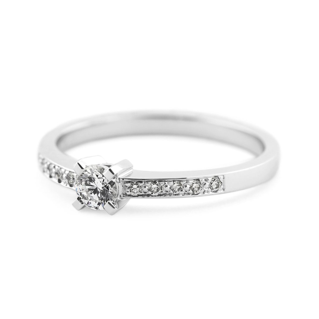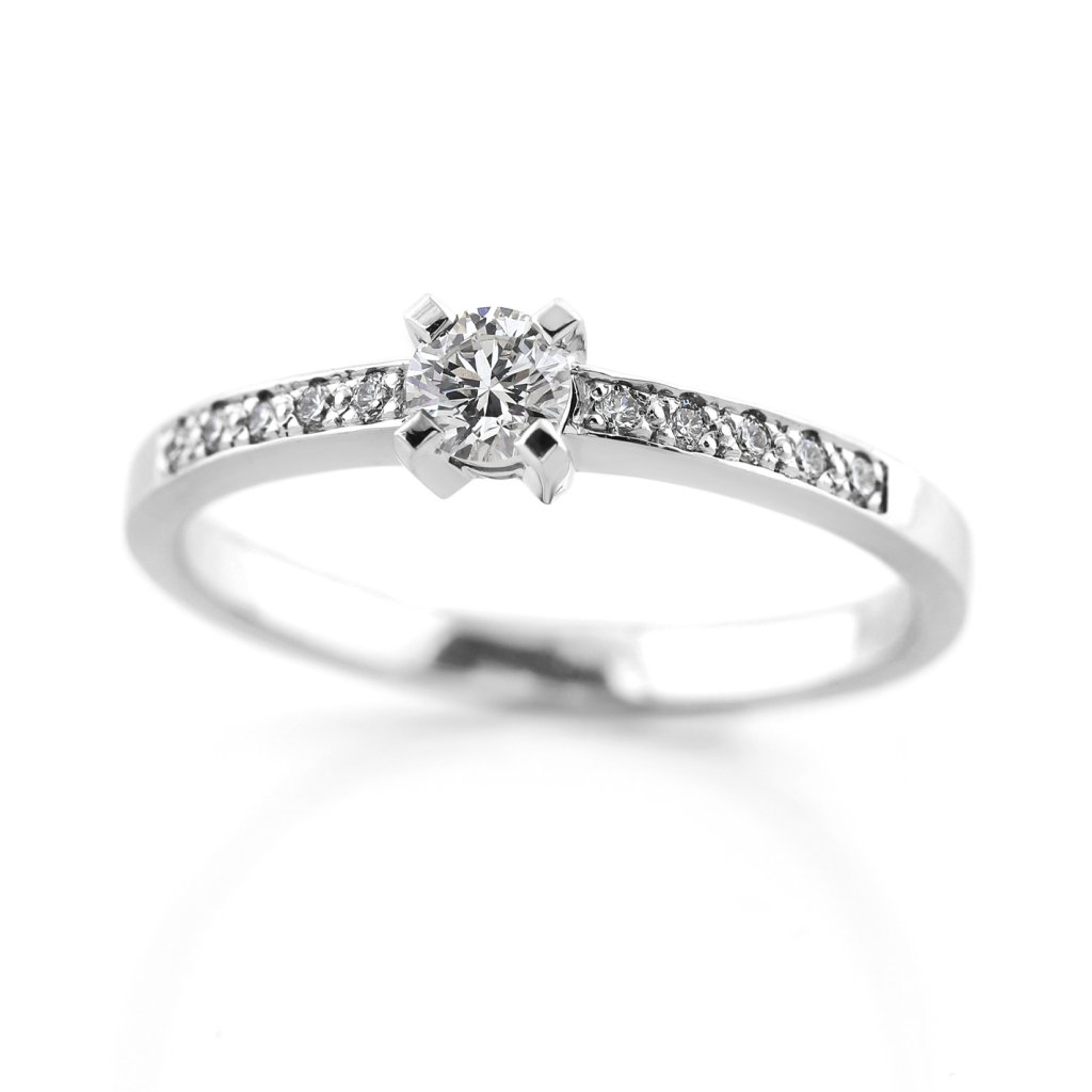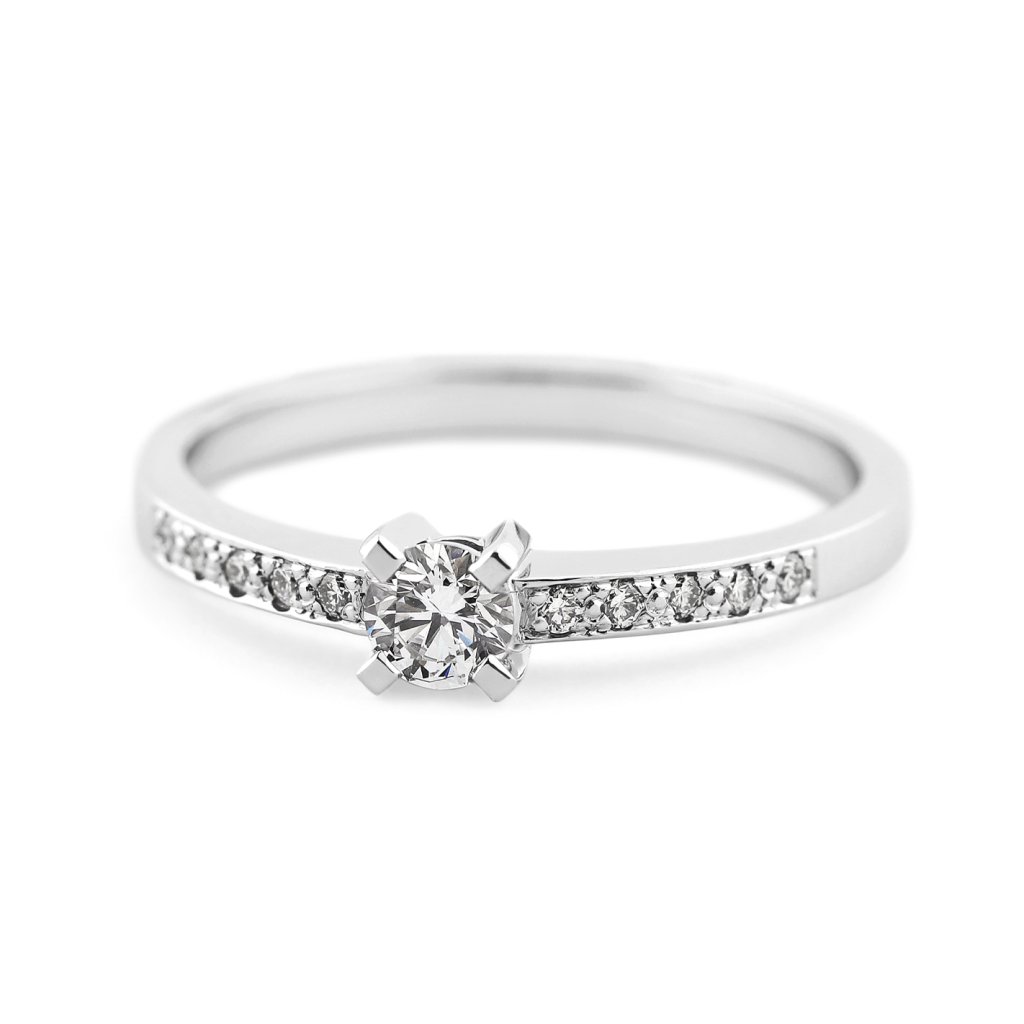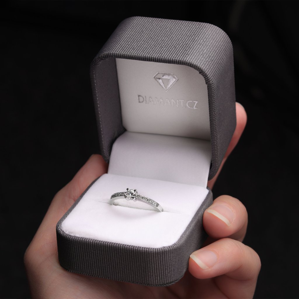Tento prsten z bílého zlata ryzosti 585/1000 je osazen celkem 11 přírodními diamanty kulatého briliantového brusu. Dominantou šperku je centrální briliant o hmotnosti 0,234 ct, který doplňuje deset menších diamantů o celkové hmotnosti 0,096 ct. Všechny použité kameny spadají do kategorie vzácně bílých (E-F) s čistotou VS, což zaručuje jejich vysokou kvalitu a intenzivní hru světla.