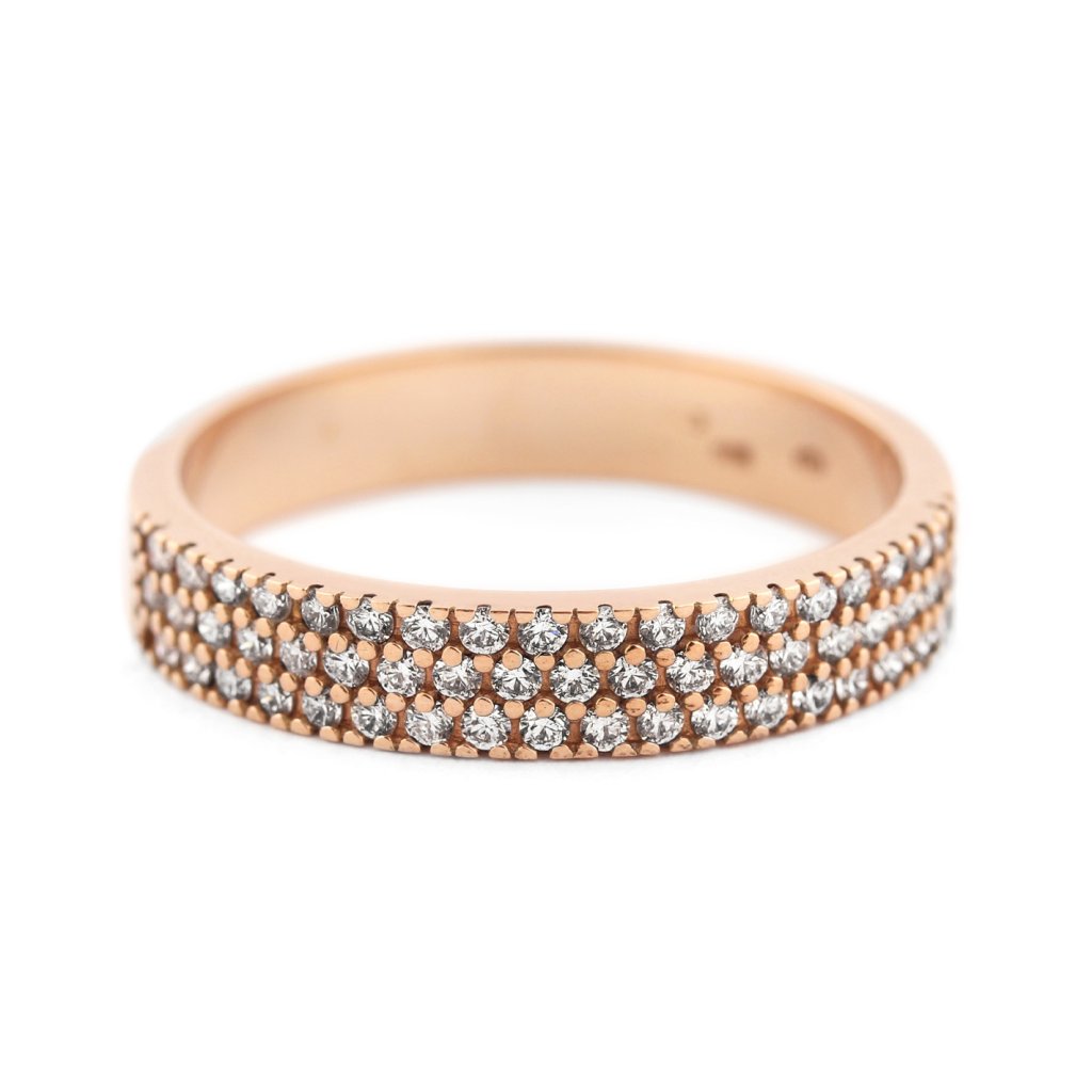 Luxusní prsten vyrobený z růžového zlata ryzosti 585/1000, který na první pohled zaujme svým bohatým a dokonale symetrickým osázením.