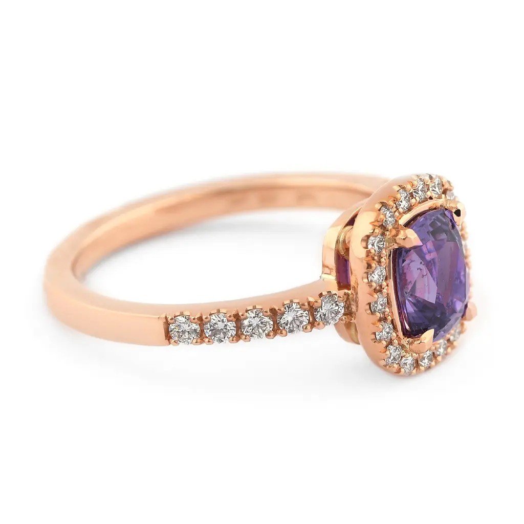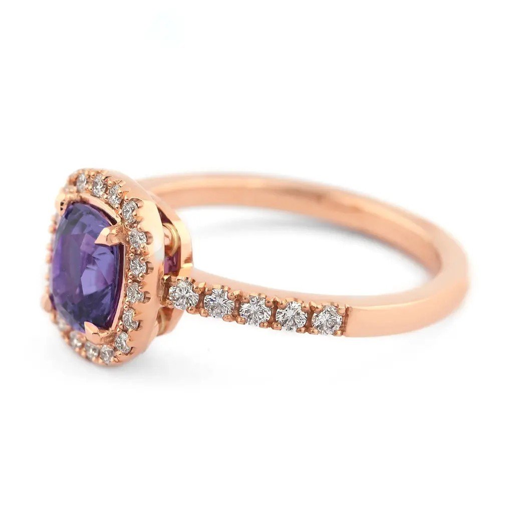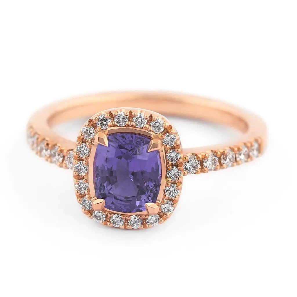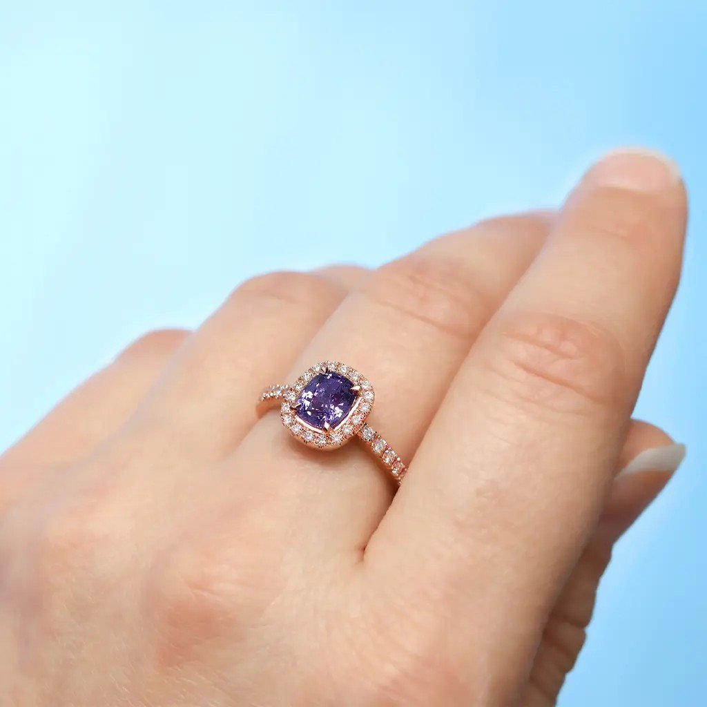 Moderní prsten z růžového zlata, který okouzlí svou originalitou i noblesou. Dominantou šperku je přírodní purpurový safír v kombinovaném brusu typu polštářek o rozměrech 6,9 × 5,75 × 3,8 mm a hmotnosti 1,297 ct. Tento vzácný kámen v odstínu nafialovělé purpurové je transparentní a bez známek tepelné úpravy (NTE), což podtrhuje jeho přirozenou krásu a autenticitu. Jeho barva působí romanticky a elegantně, připomíná jemné tóny západu slunce.
