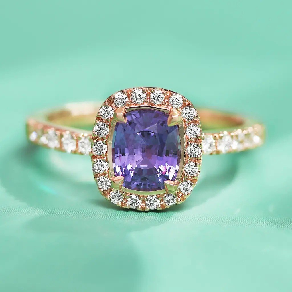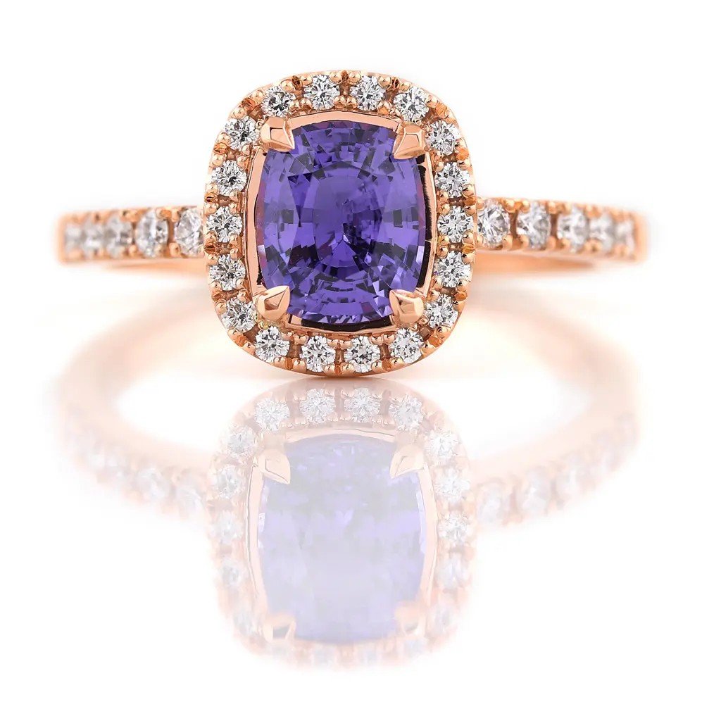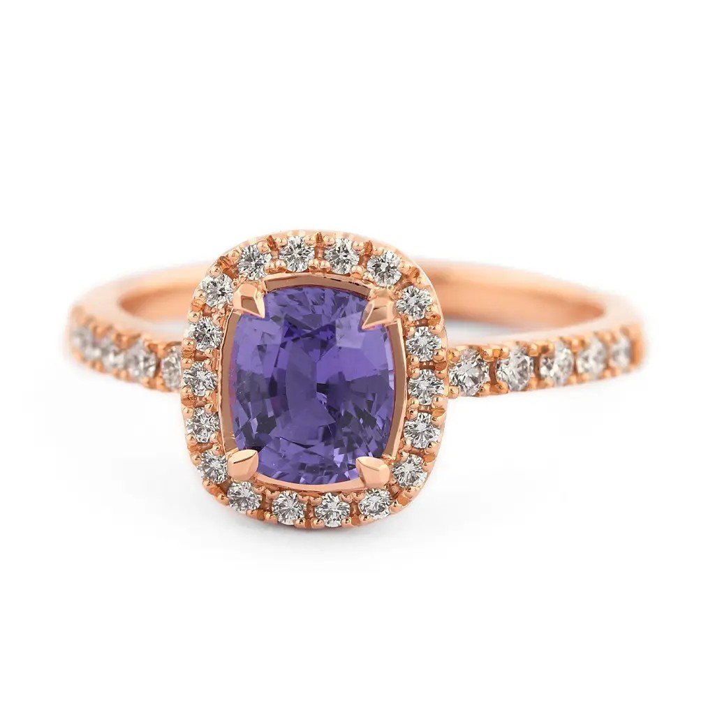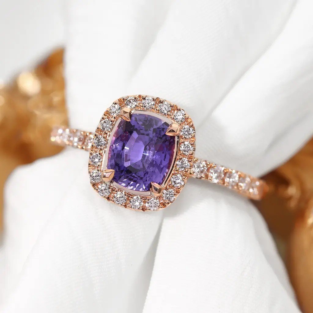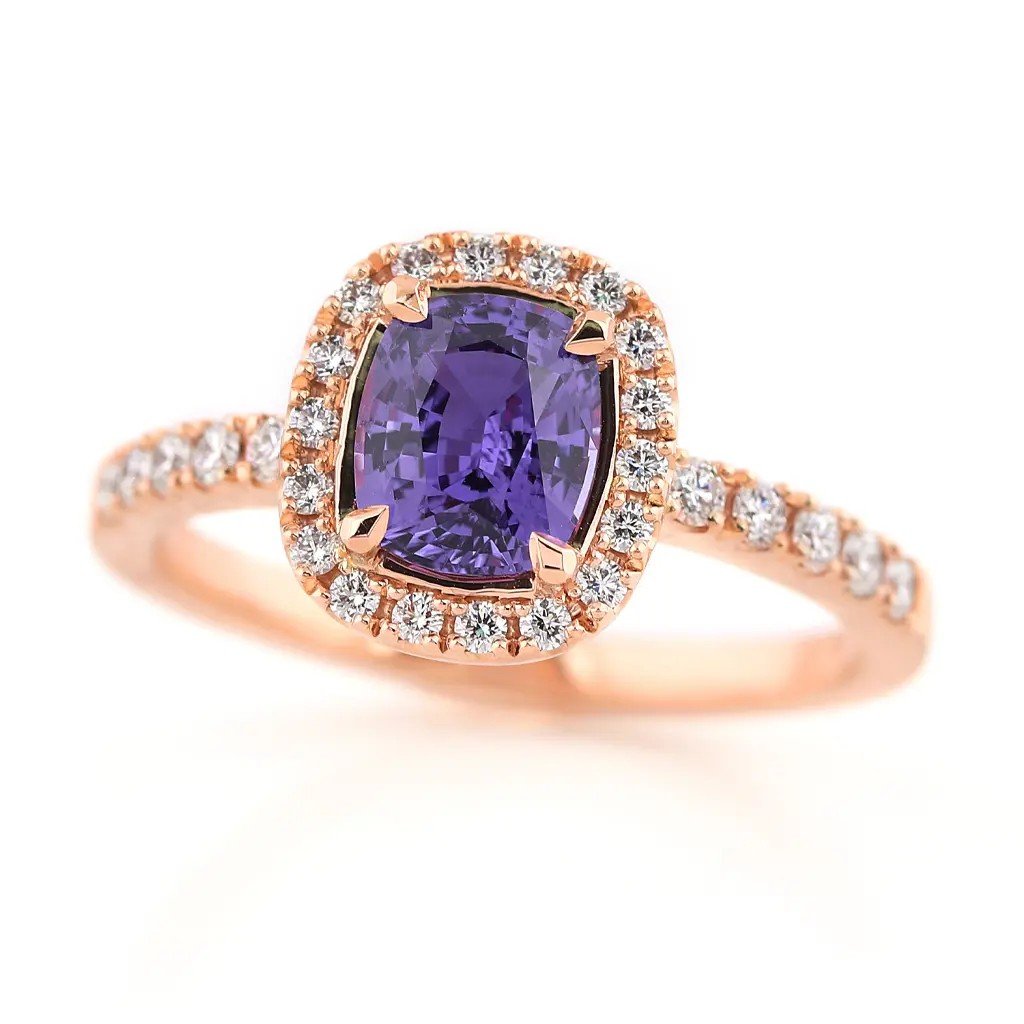 Moderní prsten z růžového zlata, který okouzlí svou originalitou i noblesou. Dominantou šperku je přírodní purpurový safír v kombinovaném brusu typu polštářek o rozměrech 6,9 × 5,75 × 3,8 mm a hmotnosti 1,297 ct. Tento vzácný kámen v odstínu nafialovělé purpurové je transparentní a bez známek tepelné úpravy (NTE), což podtrhuje jeho přirozenou krásu a autenticitu. Jeho barva působí romanticky a elegantně, připomíná jemné tóny západu slunce.