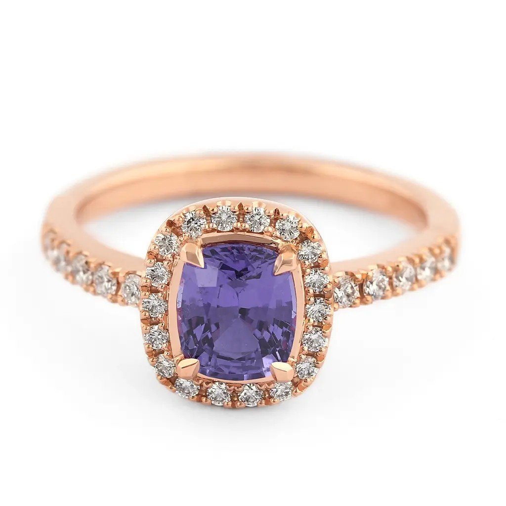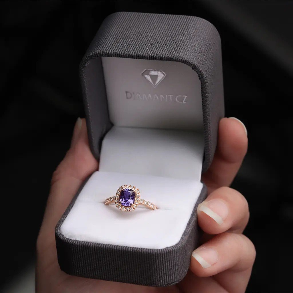 Prsten s fialovým safírem a diamanty z růžového zlata, vel. 56