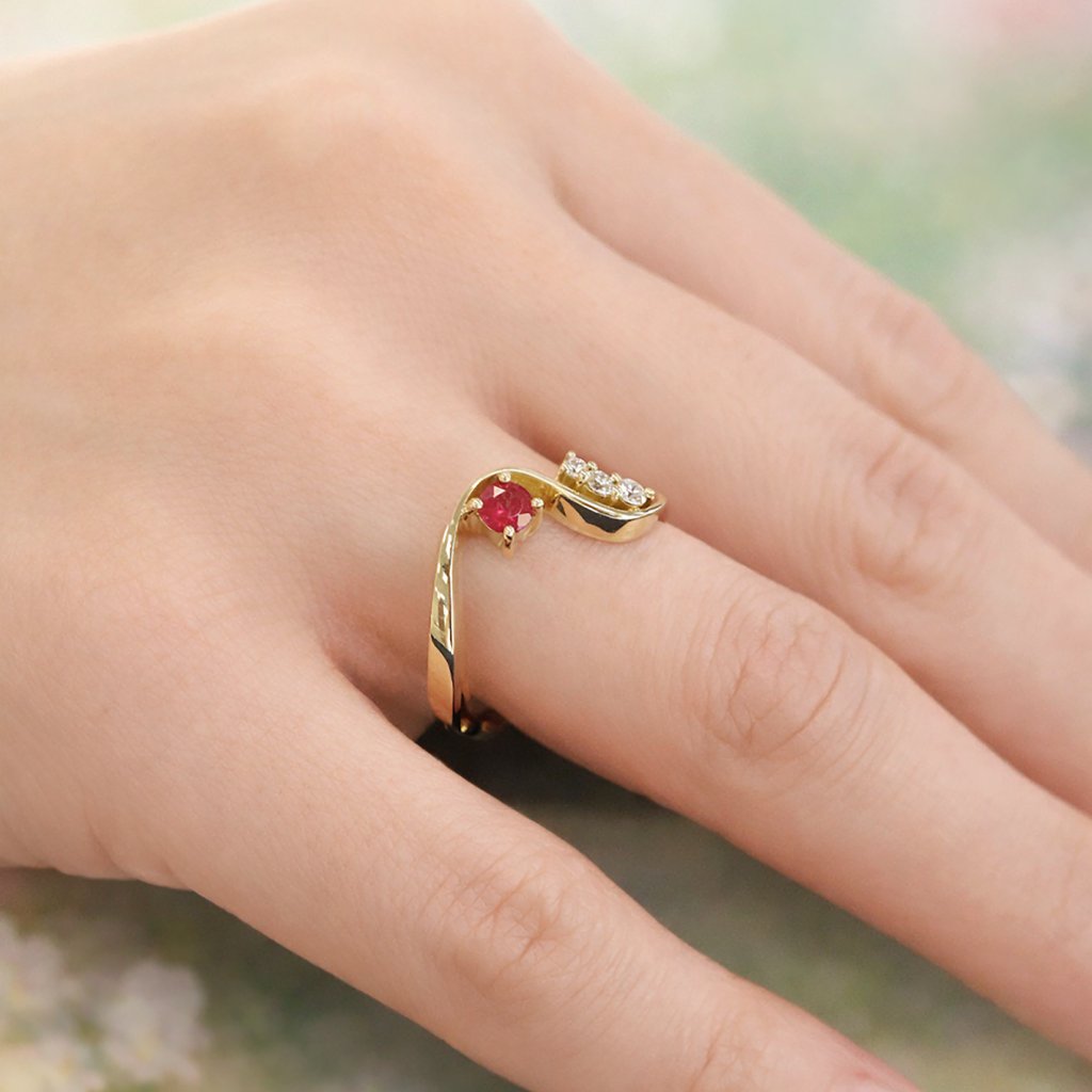Elegantní prsten ze žlutého zlata, který zaujme svým odvážným vlnitým tvarem. Spojení červeného rubínu a vzácně bílýcch diamantů vytváří šperk s moderním charakterem a výrazným stylem.
