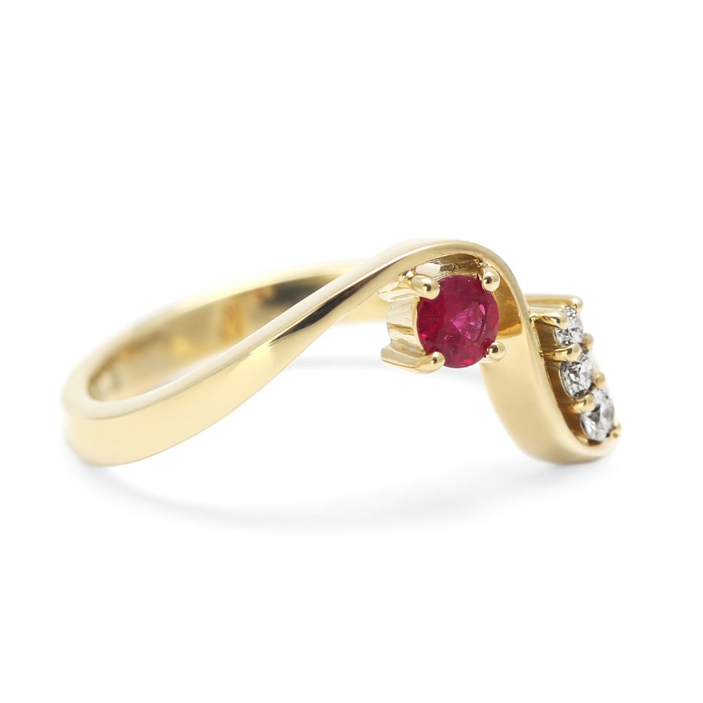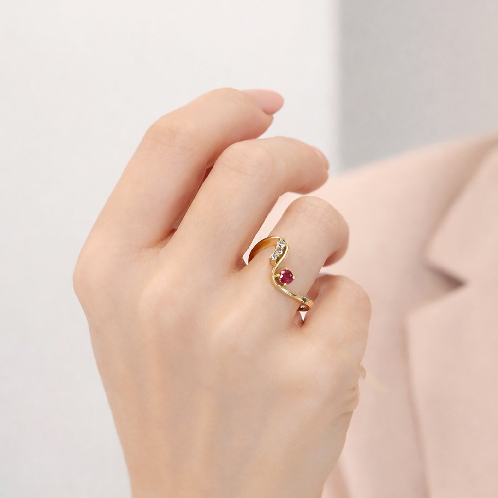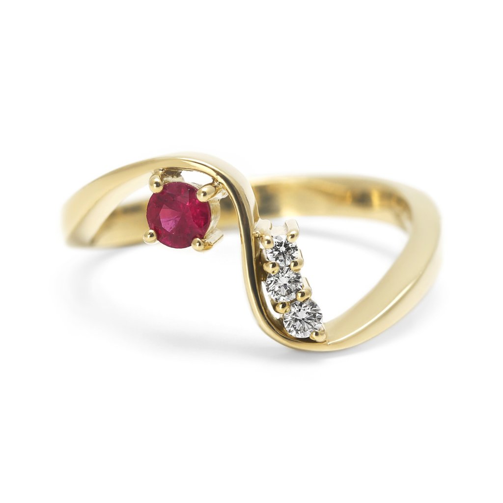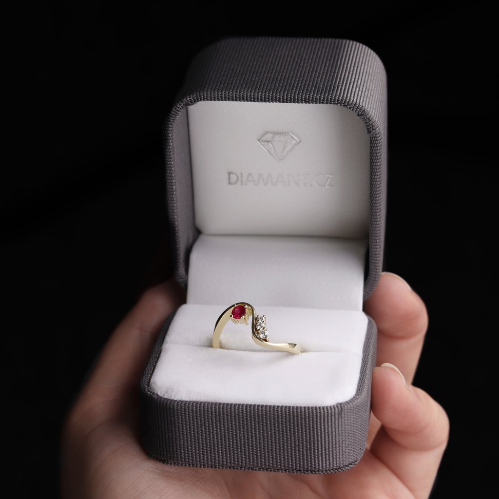 Dominantou prstenu je zářivý přírodní korund – rubín o hmotnosti 0,170 ct. Jeho lehce purpurově červená barva tvoří dokonalý kontrast k teplému tónu žlutého zlata. Designovou vlnu doplňuje linie tří přírodních diamantů v briliantovém brusu o celkové hmotnosti 0,085 ct (vzácně bílá barva G, čistota VS), které celému kousku dodávají luxusní třpyt.