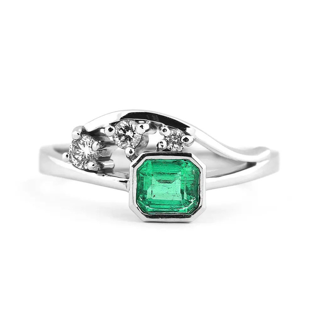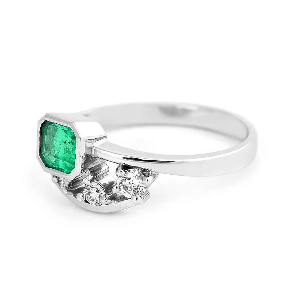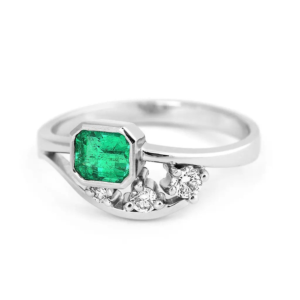 Prsten s přírodním smaragdem a diamanty z bílého zlata, vel. 57