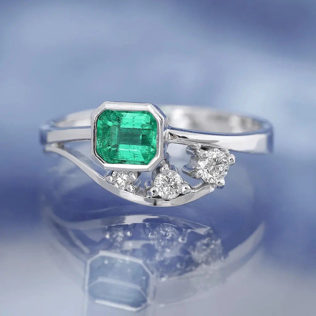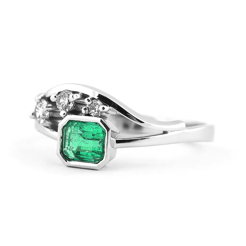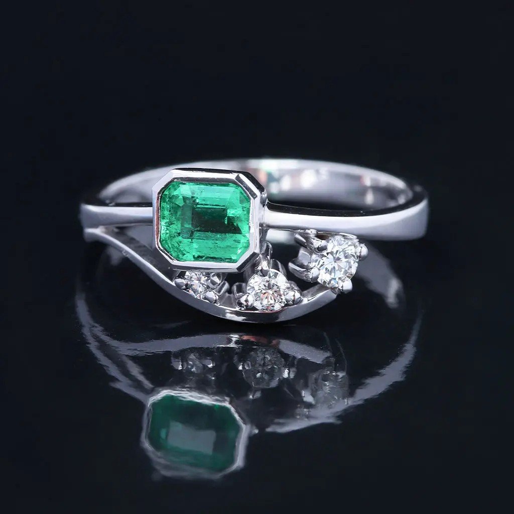 Prsten s přírodním smaragdem a diamanty z bílého zlata, vel. 57