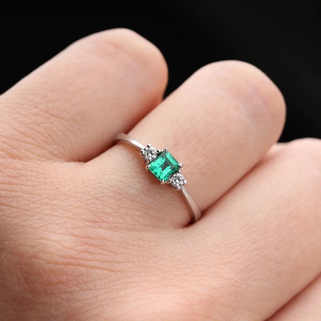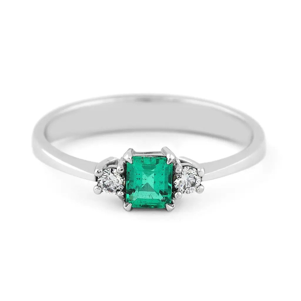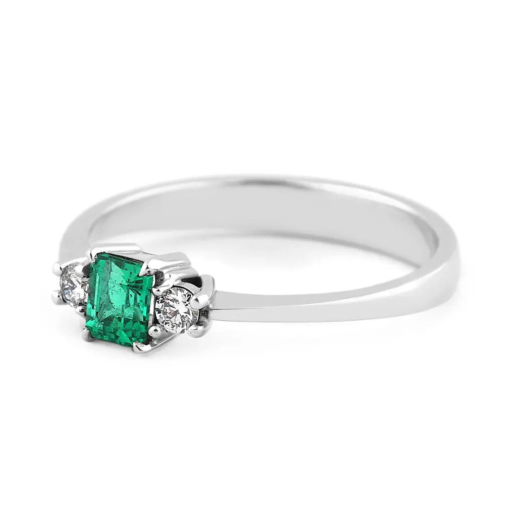 Tento ručně vyrobený prsten z bílého zlata v sobě spojuje eleganci a jemný luxus. Jeho dominantou je přírodní smaragd pocházející z Kolumbie, země proslulé těmi nejkrásnějšími zelenými drahokamy. Smaragd o hmotnosti 0,253 ct a rozměrech 4,1 × 3,55 × 2,6 mm je broušen do tuporohého obdélníku se stupňovým brusem, díky němuž vynikne jeho průzračně zelený odstín s lehkým namodralým tónem. Kámen je upraven výplní fisur (stupeň F2), což podtrhuje jeho krásu a čistotu.