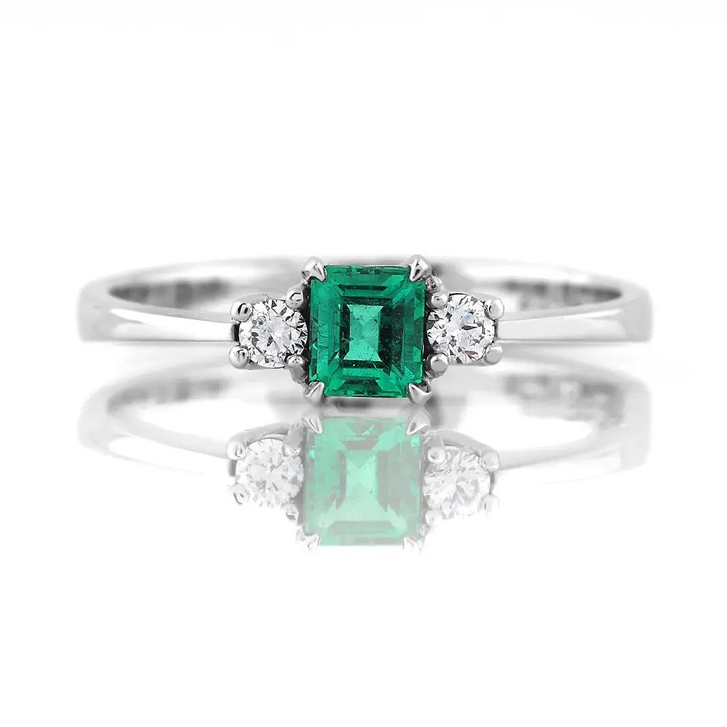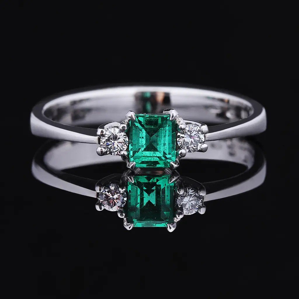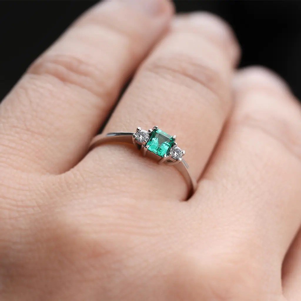 Tento ručně vyrobený prsten z bílého zlata v sobě spojuje eleganci a jemný luxus. Jeho dominantou je přírodní smaragd pocházející z Kolumbie, země proslulé těmi nejkrásnějšími zelenými drahokamy. Smaragd o hmotnosti 0,253 ct a rozměrech 4,1 × 3,55 × 2,6 mm je broušen do tuporohého obdélníku se stupňovým brusem, díky němuž vynikne jeho průzračně zelený odstín s lehkým namodralým tónem. Kámen je upraven výplní fisur (stupeň F2), což podtrhuje jeho krásu a čistotu.