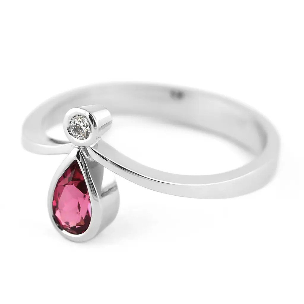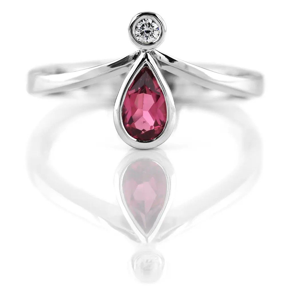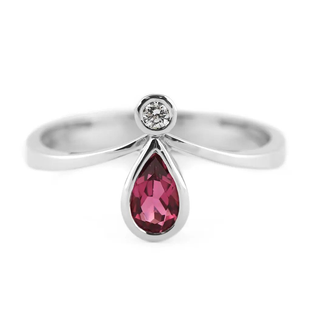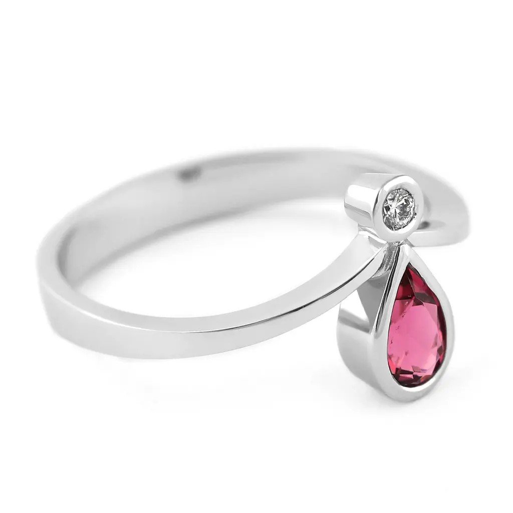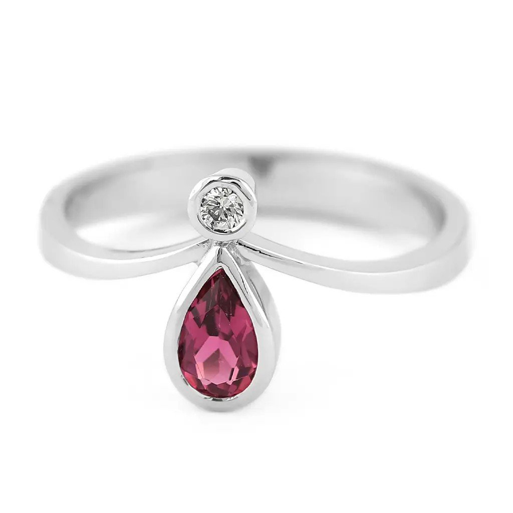 Ručně vyrobený prsten z bílého zlata s nádherným načervenale purpurovým turmalínem a dvěma jemnými diamanty je šperkem, který rozzáří každý okamžik. Transparentní turmalín o rozměru ~6×4 mm a hmotnosti 0,393 ct v pantlok fasetě zachycuje světlo a odráží jeho jemné tóny srdce. Dva kulaté brilianty o průměru 2,1 mm a celkové hmotnosti 0,070 ct doplňují šperk o jemný třpyt a nadčasovou eleganci.