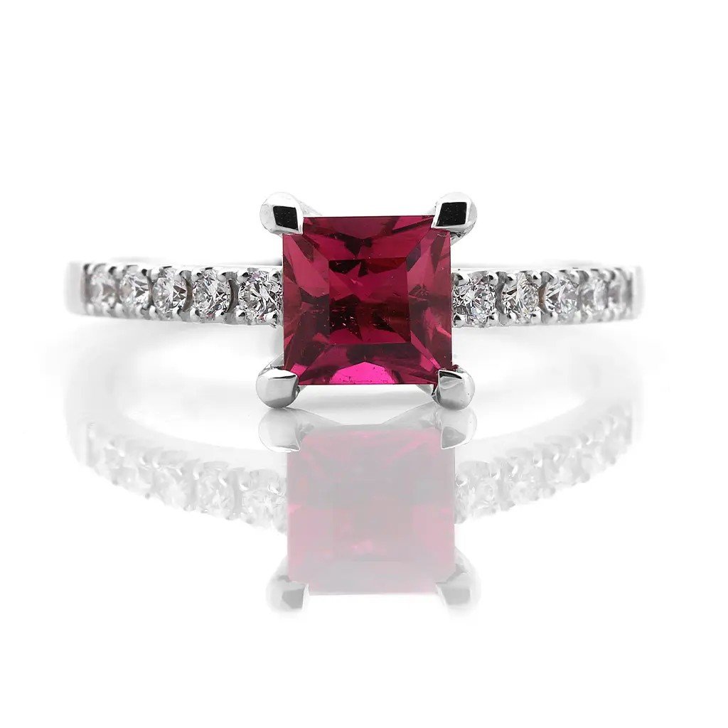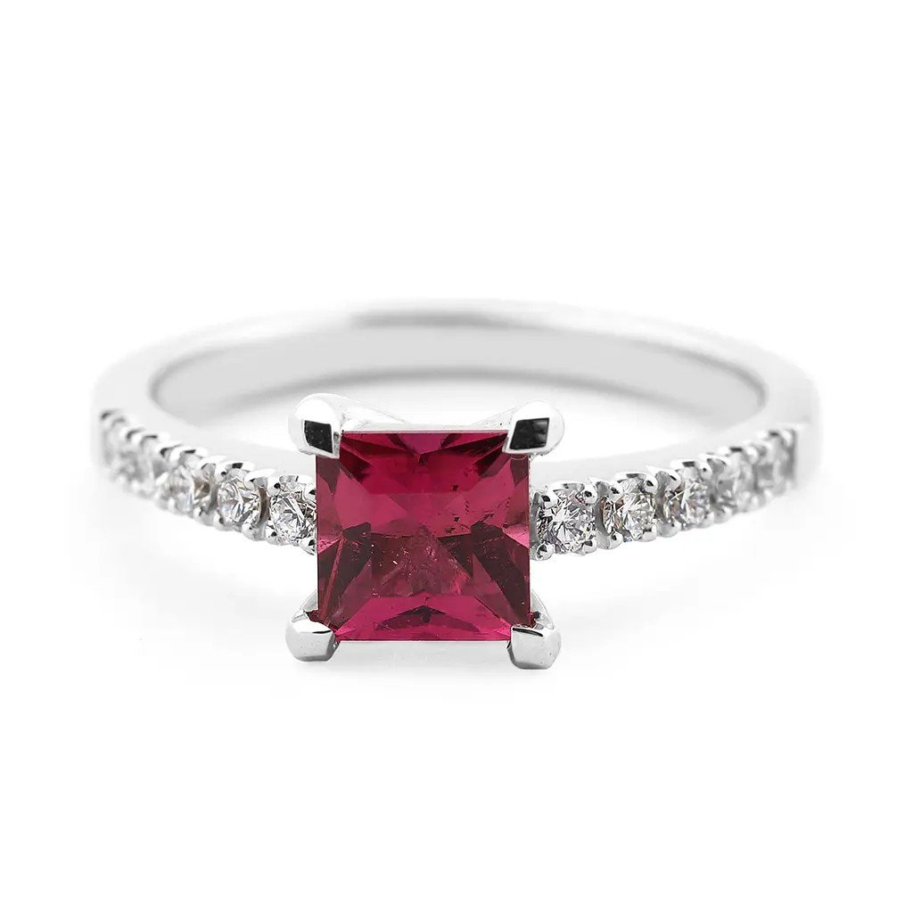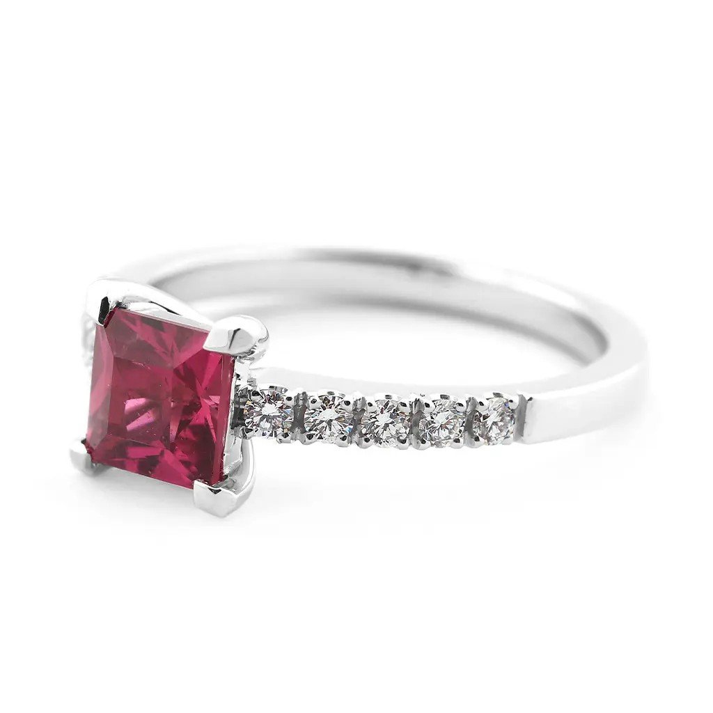 Středem šperku je přírodní turmalín v načervenale purpurovém odstínu, vybroušený do tvaru roháčku kombinovaným brusem. Drahokam o rozměrech 5,7 × 5,65 × 3,65 mm a hmotnosti 0,812 ct vyniká svou transparentní krásou a neobvyklou barvou, která prstenu dodává osobitost a charakter.
