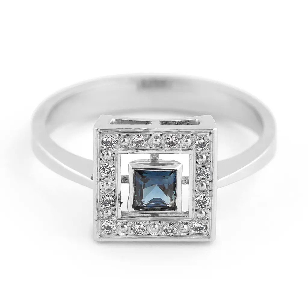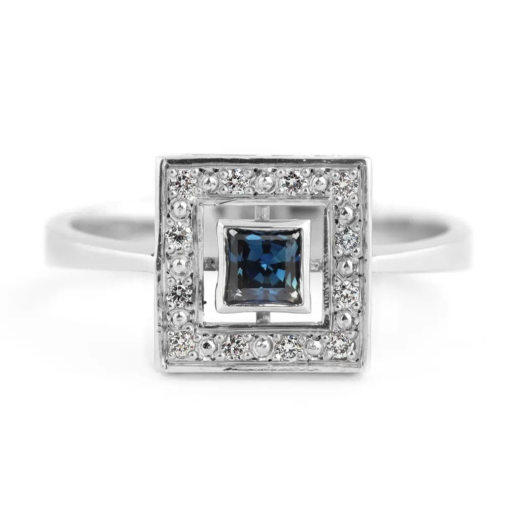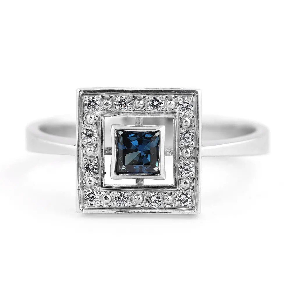 Moderní prsten z bílého zlata, který se stane symbolem elegance i hlubokých citů. V jeho srdci září tmavě modrý přírodní safír čtvercového tvaru o rozměrech 3,5 × 3,5 mm a hmotnosti 0,245 ct. Tento safír, jenž prošel jemnou tepelnou úpravou (TE), okouzlí svou transparentní krásou a barvou připomínající noční oblohu plnou tajemství.