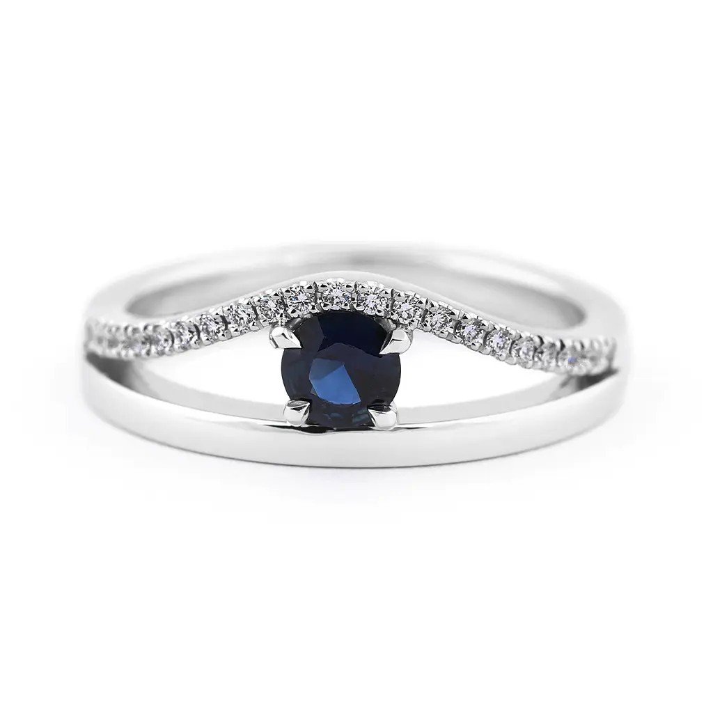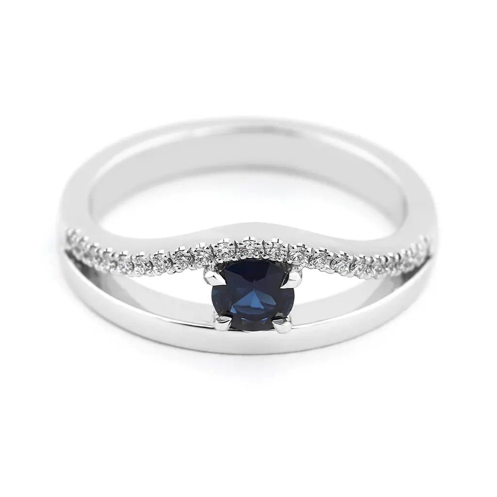 Moderní prsten z bílého zlata s modrým safírem a diamanty vyniká originálním asymetrickým designem. Elegantní šperk, který lze doplnit o náušnice a přívěsek do jedinečné sady.