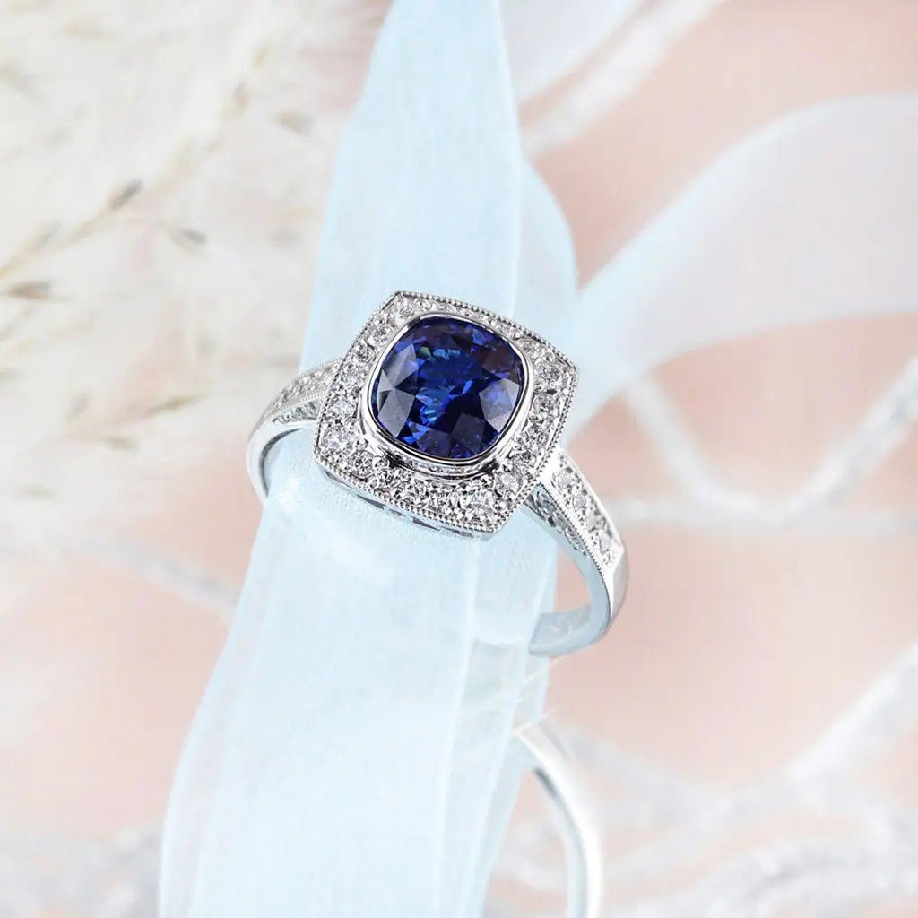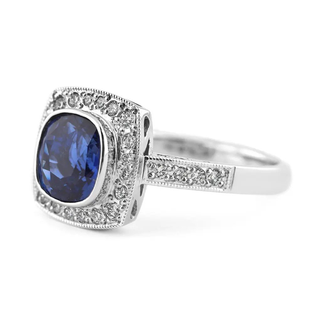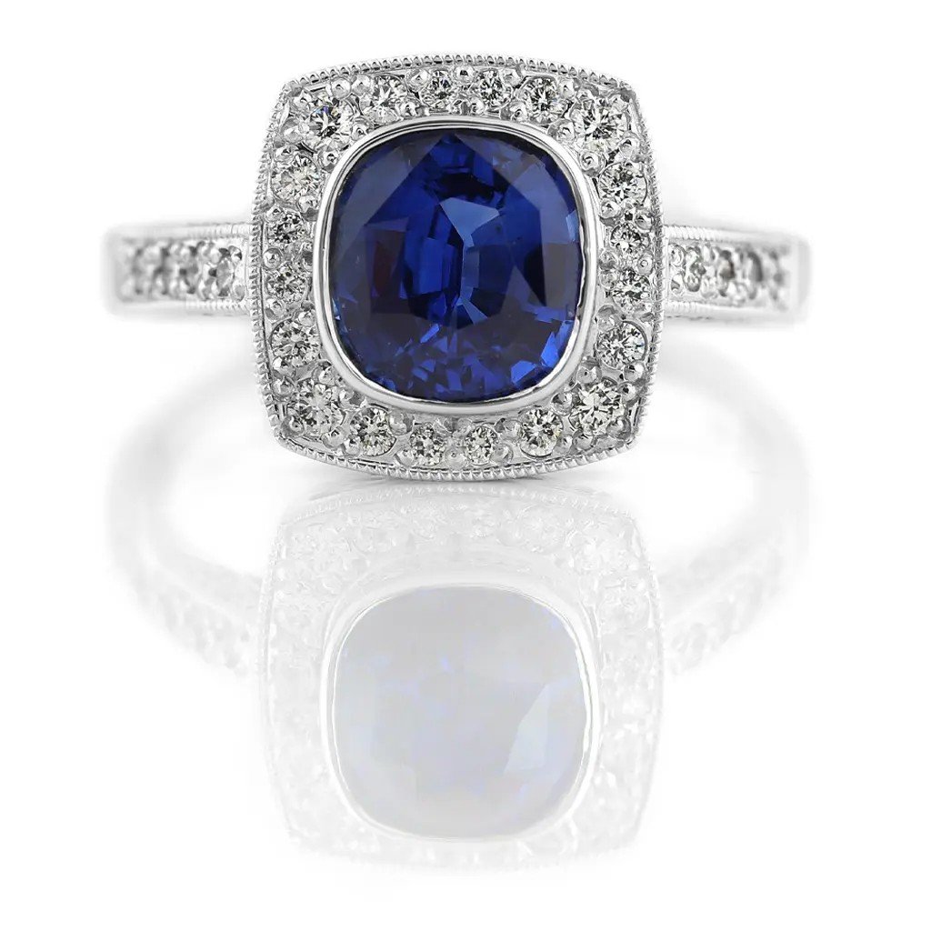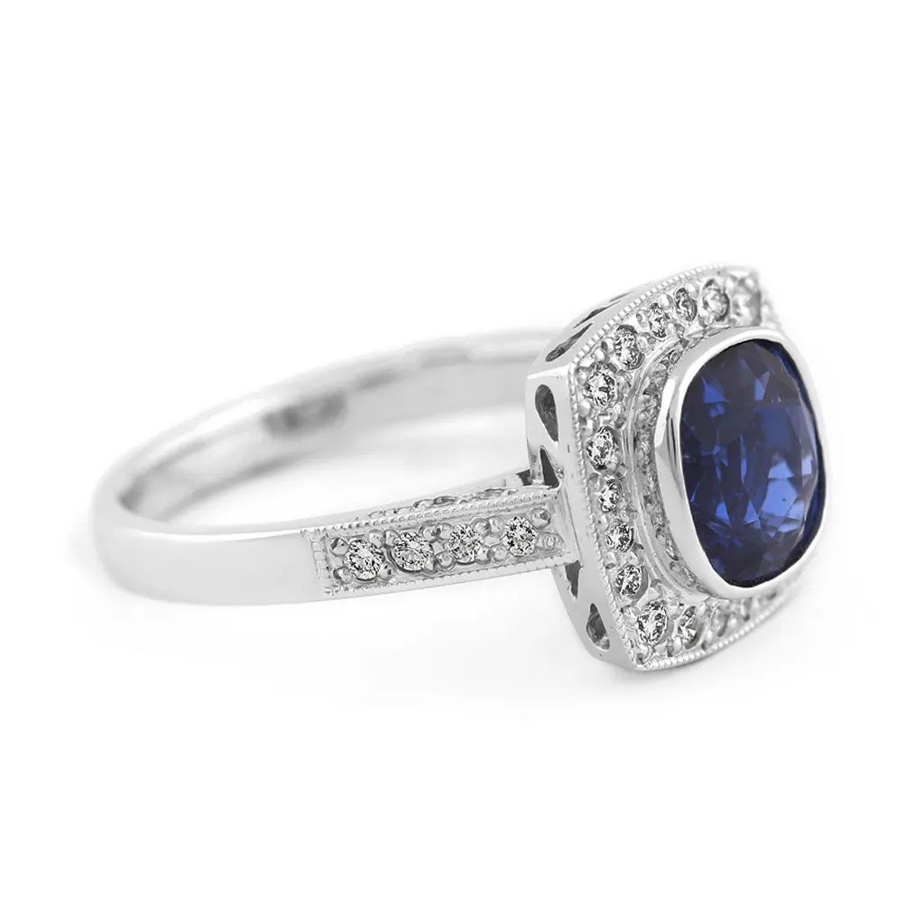 Prsten z bílého zlata s modrým safírem o váze 2,186 ct a 36 diamanty. Luxusní šperk, který se stane nepřehlédnutelným symbolem lásky a výjimečných okamžiků.