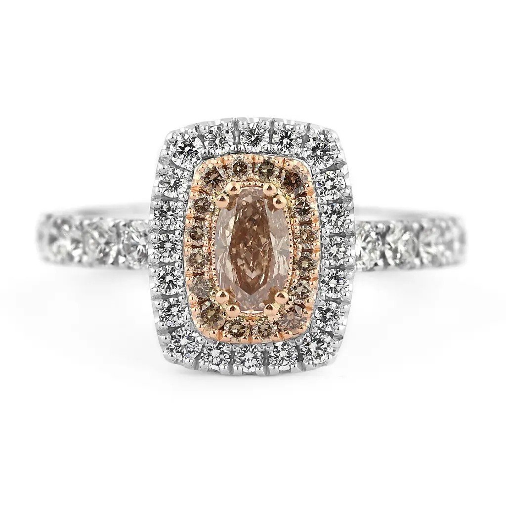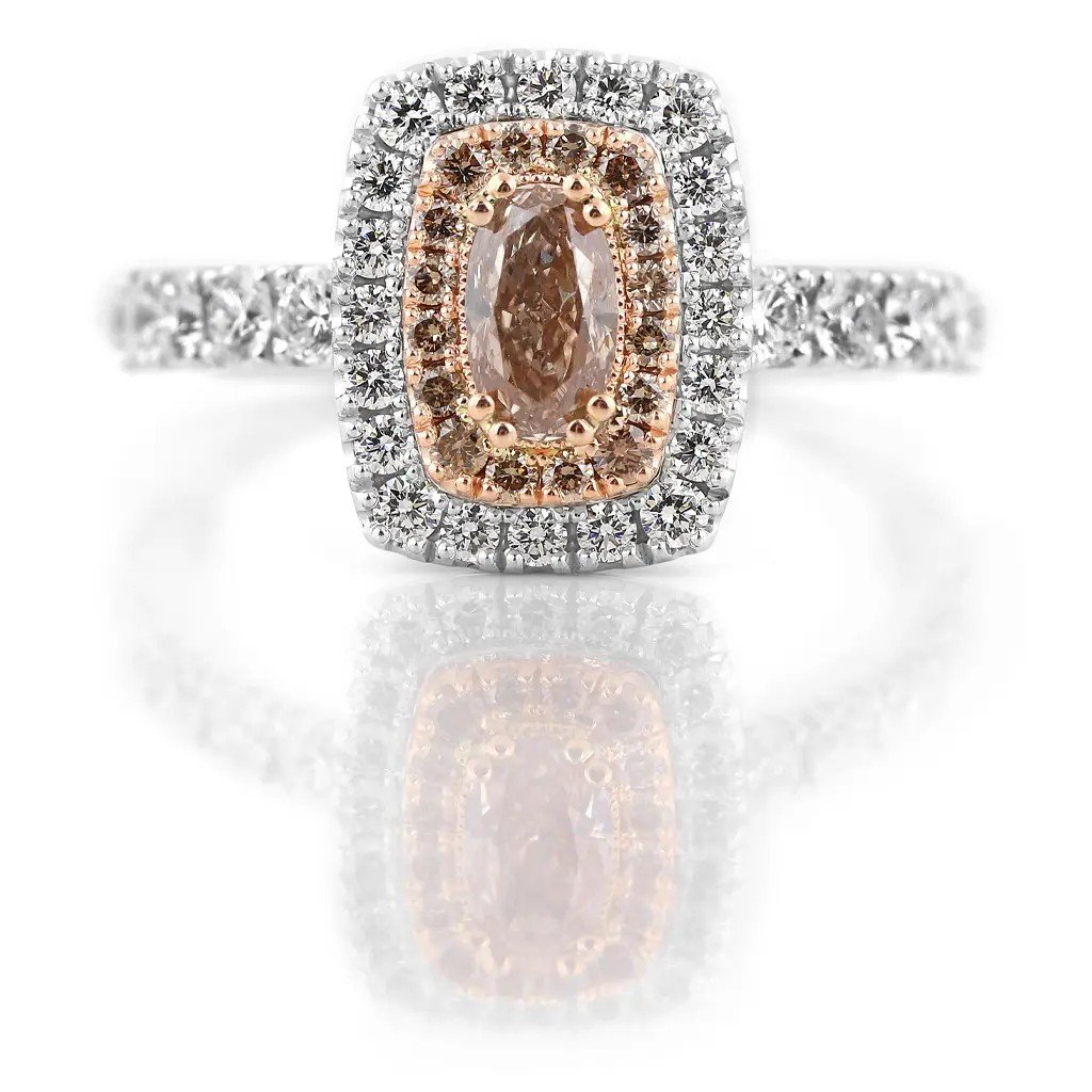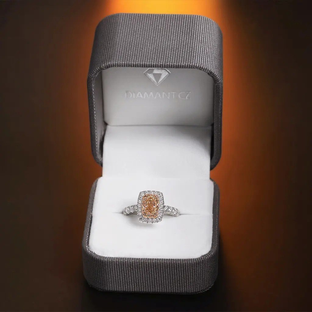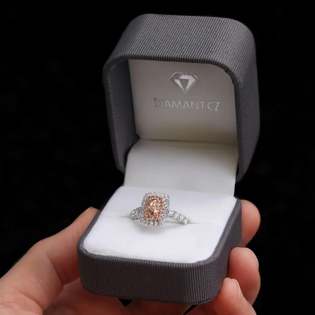 Dominantou prstenu je přírodní oválný diamant briliantového brusu v odstínu fancy – jemně narůžověle světle hnědý. Tento výjimečný kámen o hmotnosti 0,503 ct a čistotě VS1 dodává šperku jedinečnost a noblesu. Celkový dojem doplňuje šestnáct hnědých kulatých diamantů (0,150 ct), dvacet vzácně bílých diamantů (0,264 ct, barva F–G, čistota VS) a deset větších bílých briliantů (0,536 ct). Dohromady tvoří fascinující hru světel, která upoutá na první pohled.