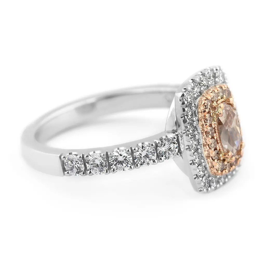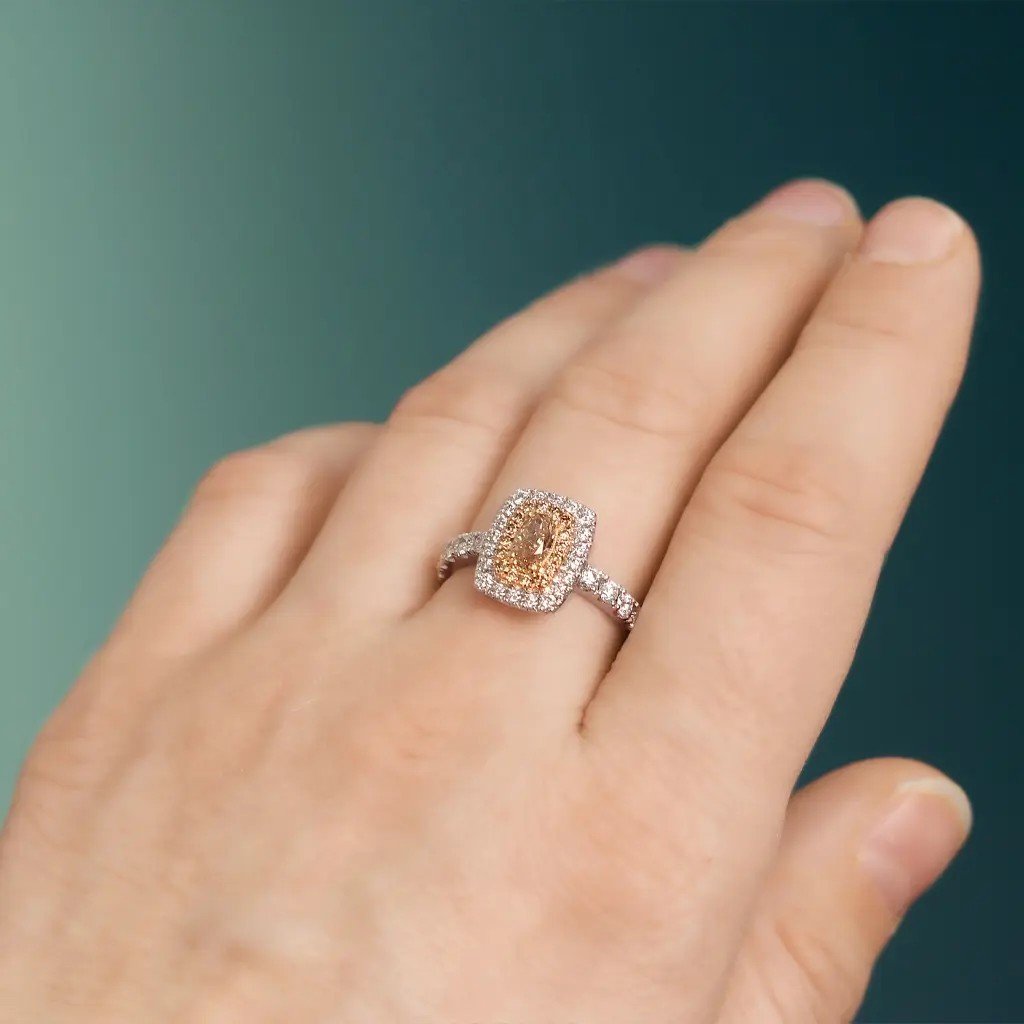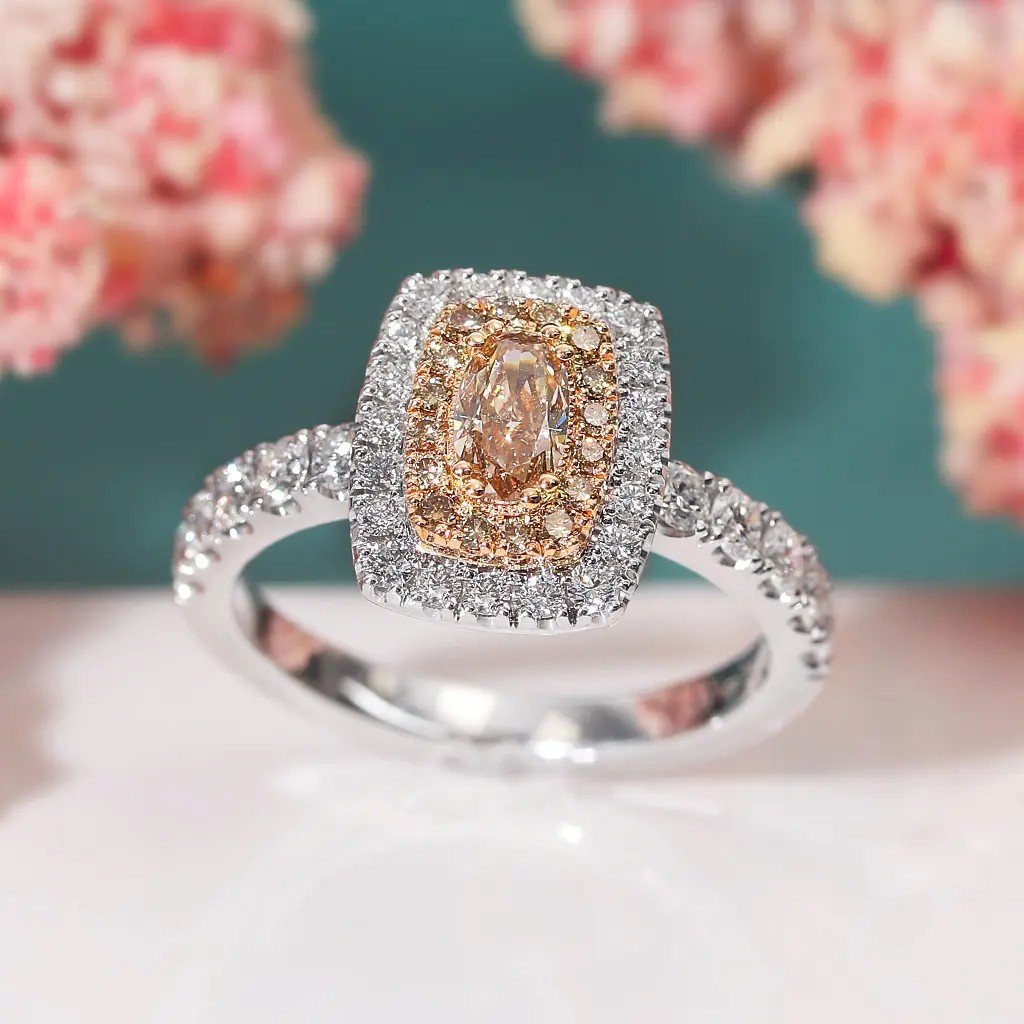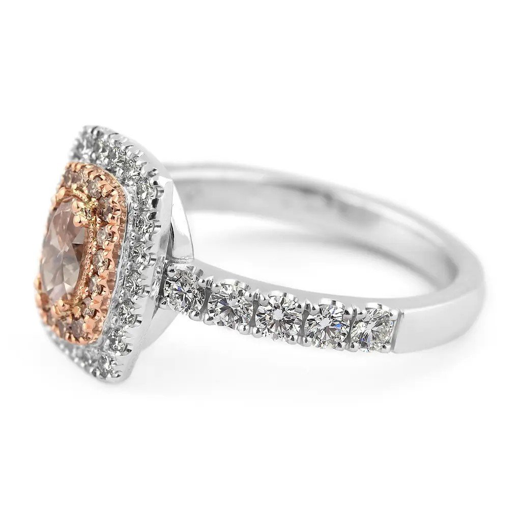 Dominantou prstenu je přírodní oválný diamant briliantového brusu v odstínu fancy – jemně narůžověle světle hnědý. Tento výjimečný kámen o hmotnosti 0,503 ct a čistotě VS1 dodává šperku jedinečnost a noblesu. Celkový dojem doplňuje šestnáct hnědých kulatých diamantů (0,150 ct), dvacet vzácně bílých diamantů (0,264 ct, barva F–G, čistota VS) a deset větších bílých briliantů (0,536 ct). Dohromady tvoří fascinující hru světel, která upoutá na první pohled.