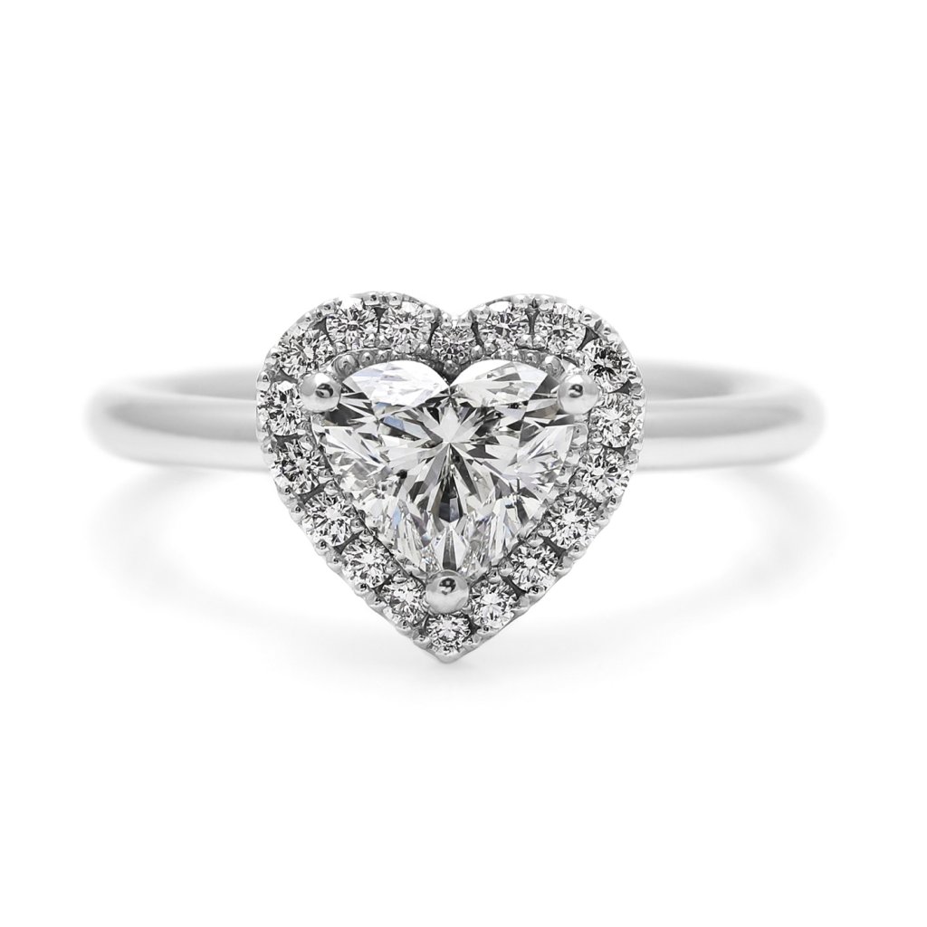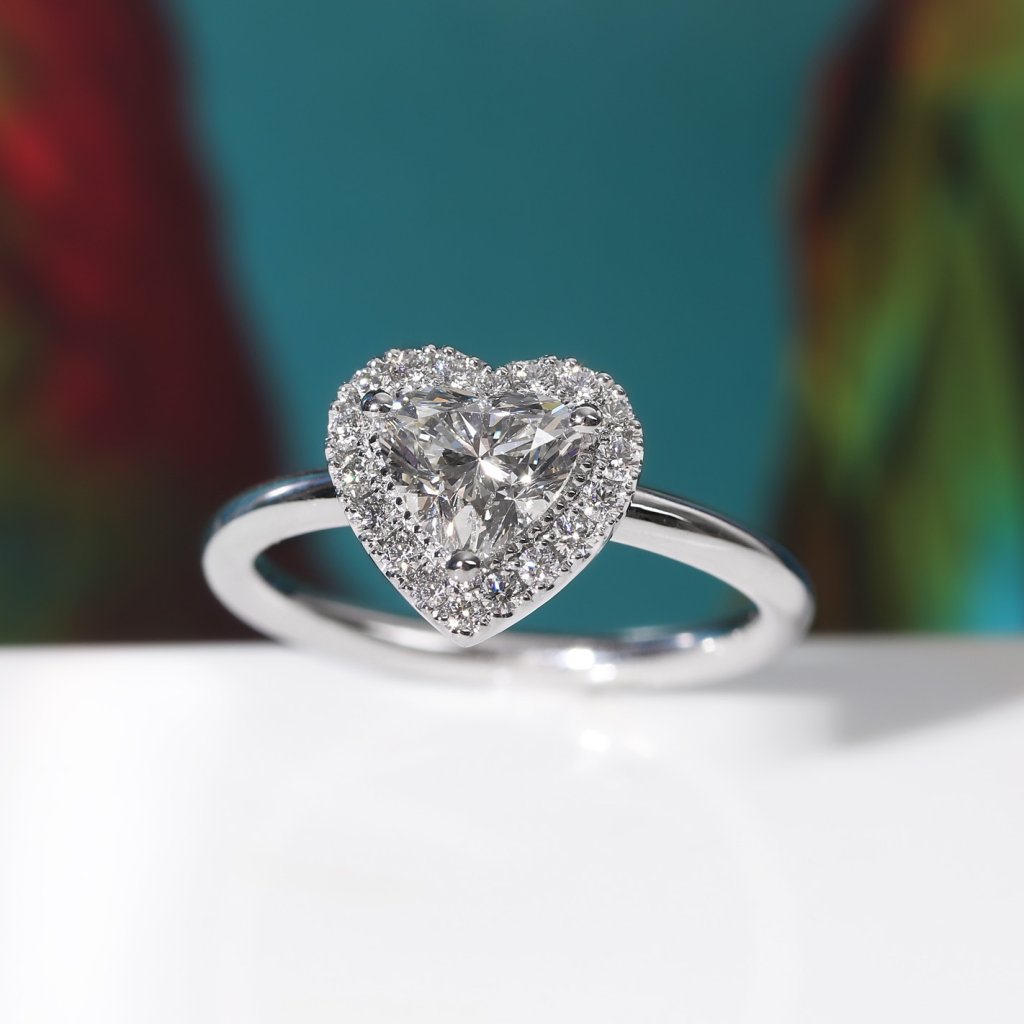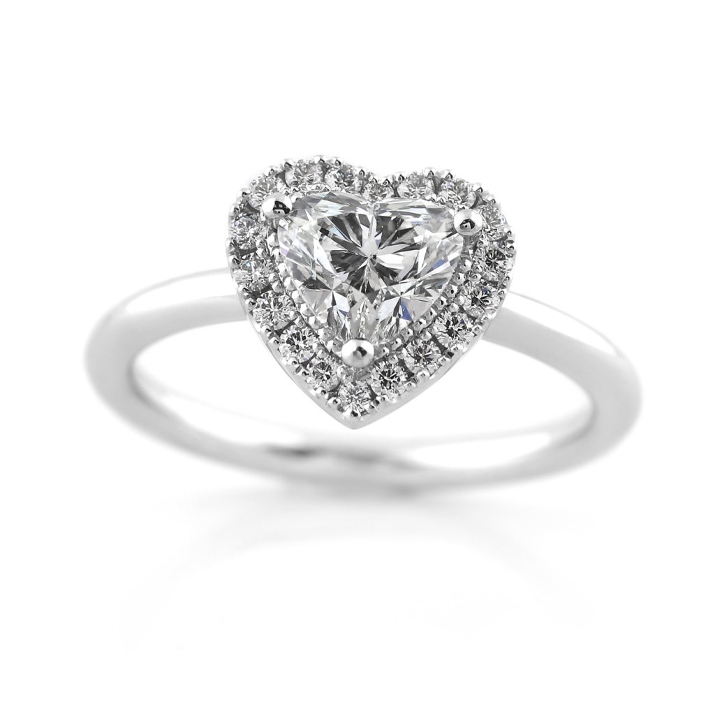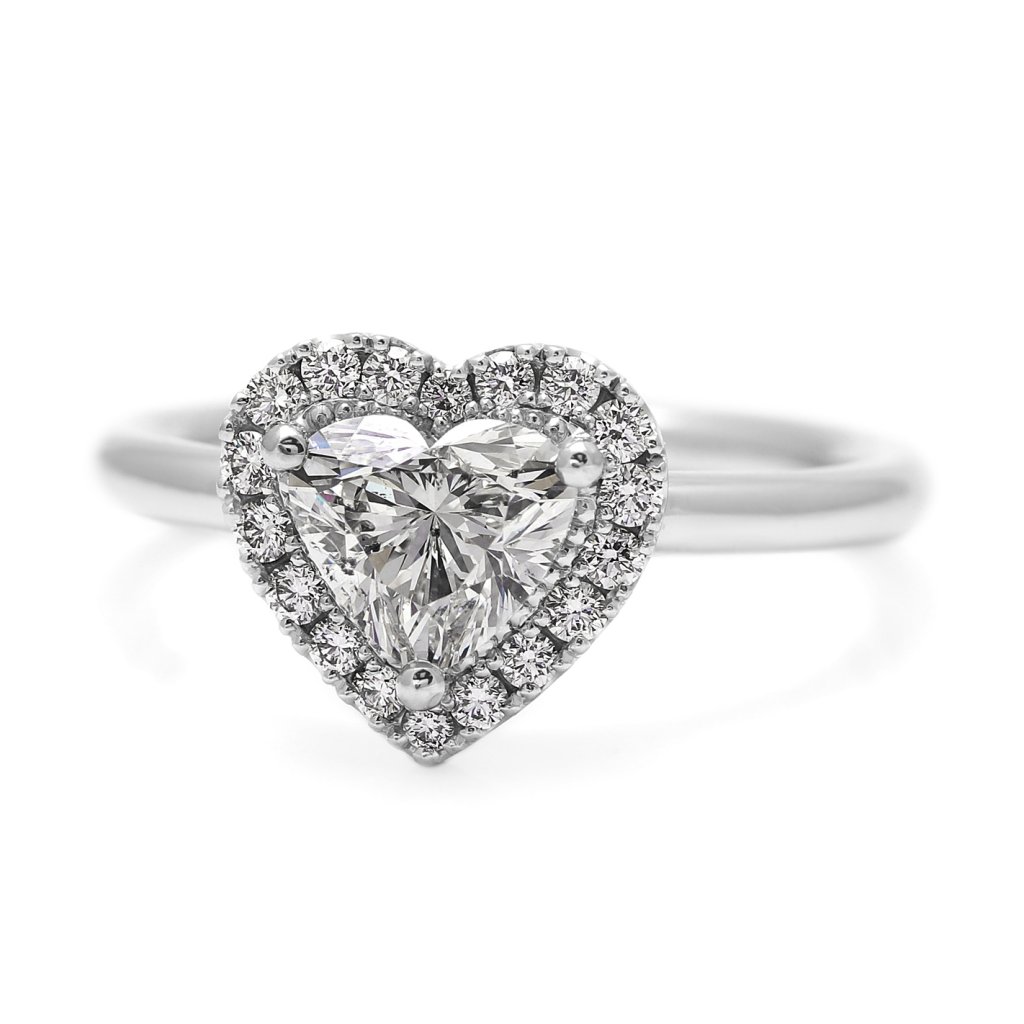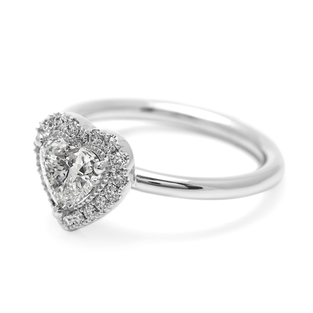 Hlavní dominantou je přírodní diamant o hmotnosti 1,00 ct ve tvaru srdce. Kámen disponuje prestižním certifikátem GIA (č. 6452268889), barvou vzácně bílou (G) a čistotou SI2. Centrální kámenje vkusně obklopen 18 kulatými brilianty o celkové hmotnosti 0,202 ct (barva F-G, čistota VS). Tato kombinace vytváří fascinující hru světla a podtrhuje výjimečný brus dominantního srdce.