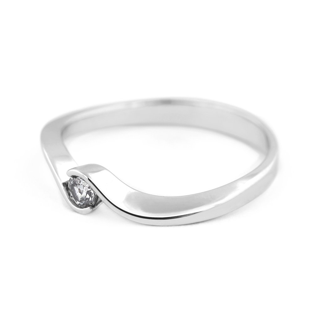 Moderní prsten z bílého zlata zdobený centrálním briliantem v elegantním napínaném osazení. Čisté linie, jemný třpyt a nadčasová elegance.