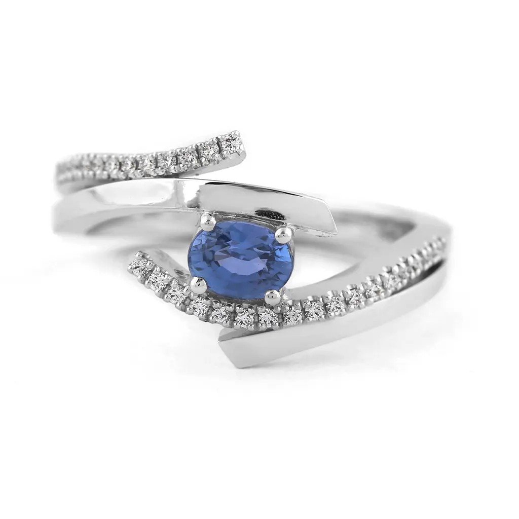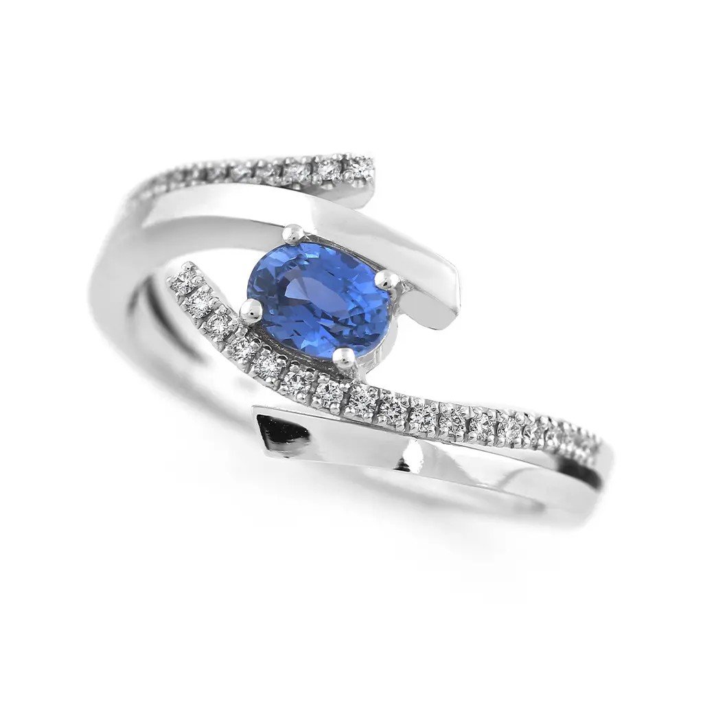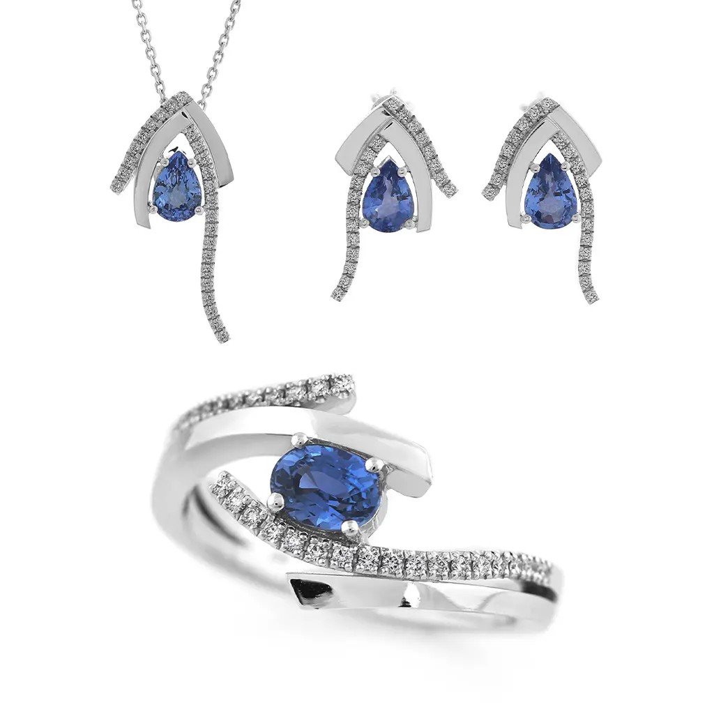 Elegantní prsten z bílého zlata s modrým safírem a diamanty, který v sobě spojuje jemnost, noblesu a nadčasovou krásu. K dispozici je i jako součást luxusního setu s náušnicemi a přívěskem.