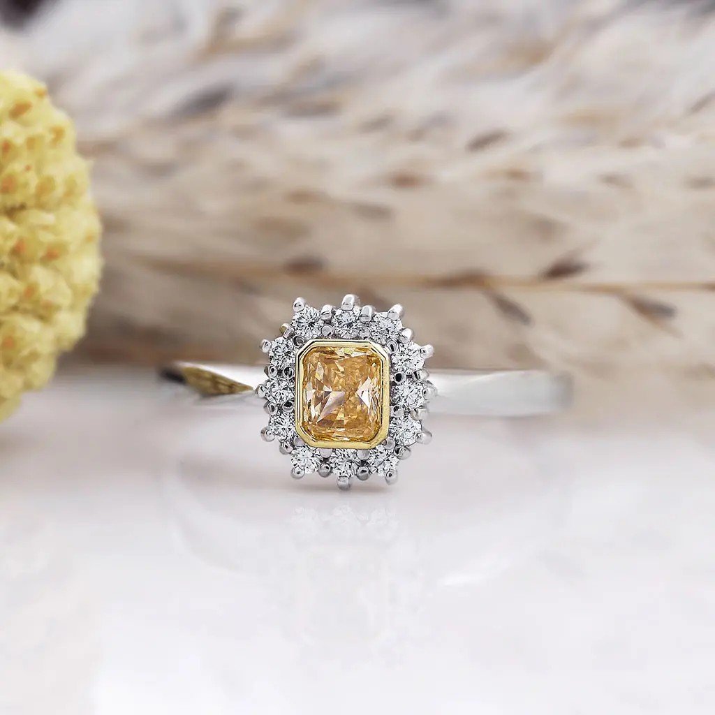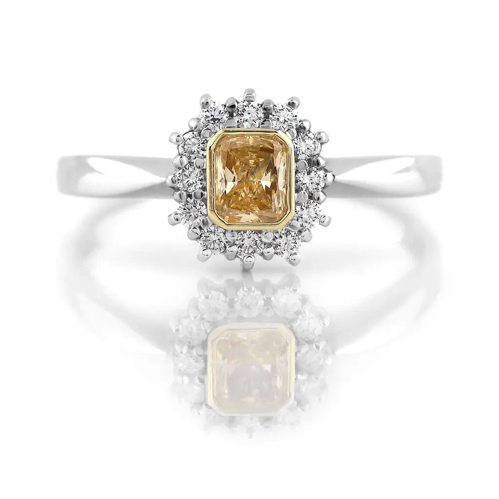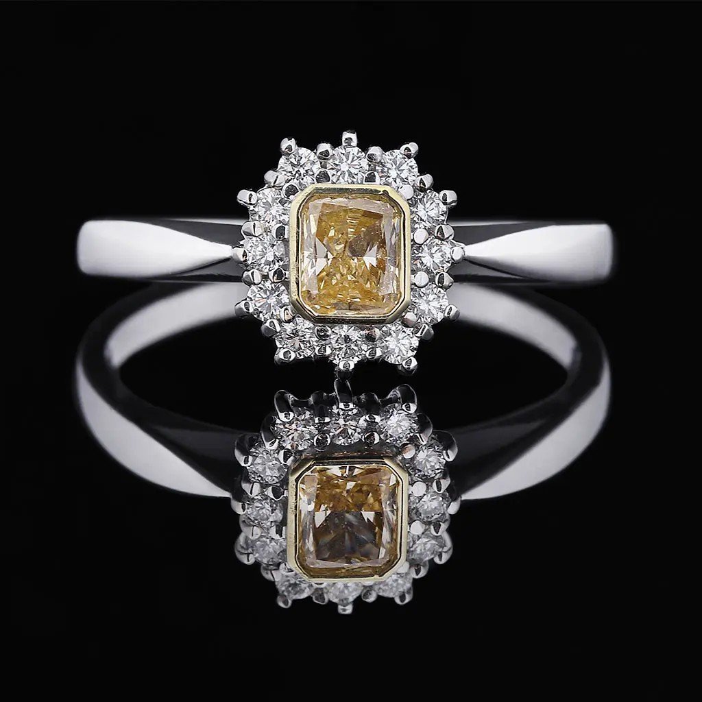 Výjimečný prsten z bílého zlata zdobený žlutým diamantem v polštářkovém brusu a dvanácti bílými diamanty. Luxusní šperk, který se dědí po generace.