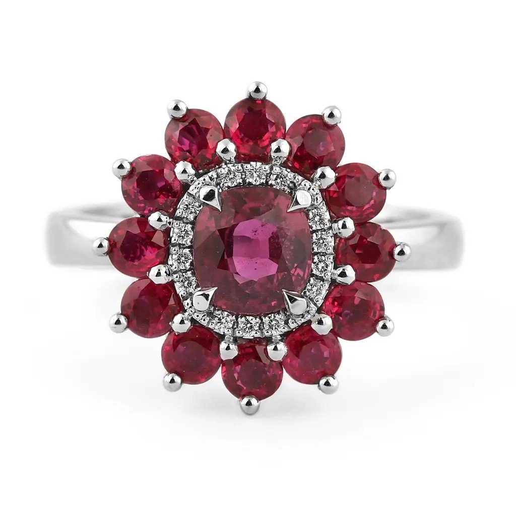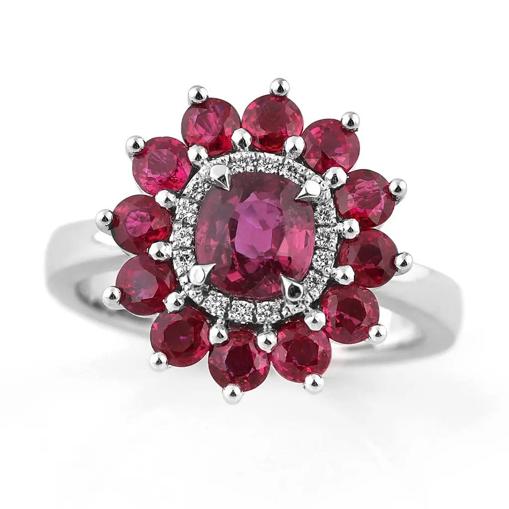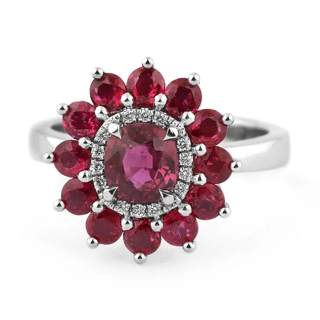 Okouzlující prsten z bílého zlata s rubíny a diamanty, který spojuje luxus, eleganci a nadčasovou krásu – ideální jako výjimečný dárek.