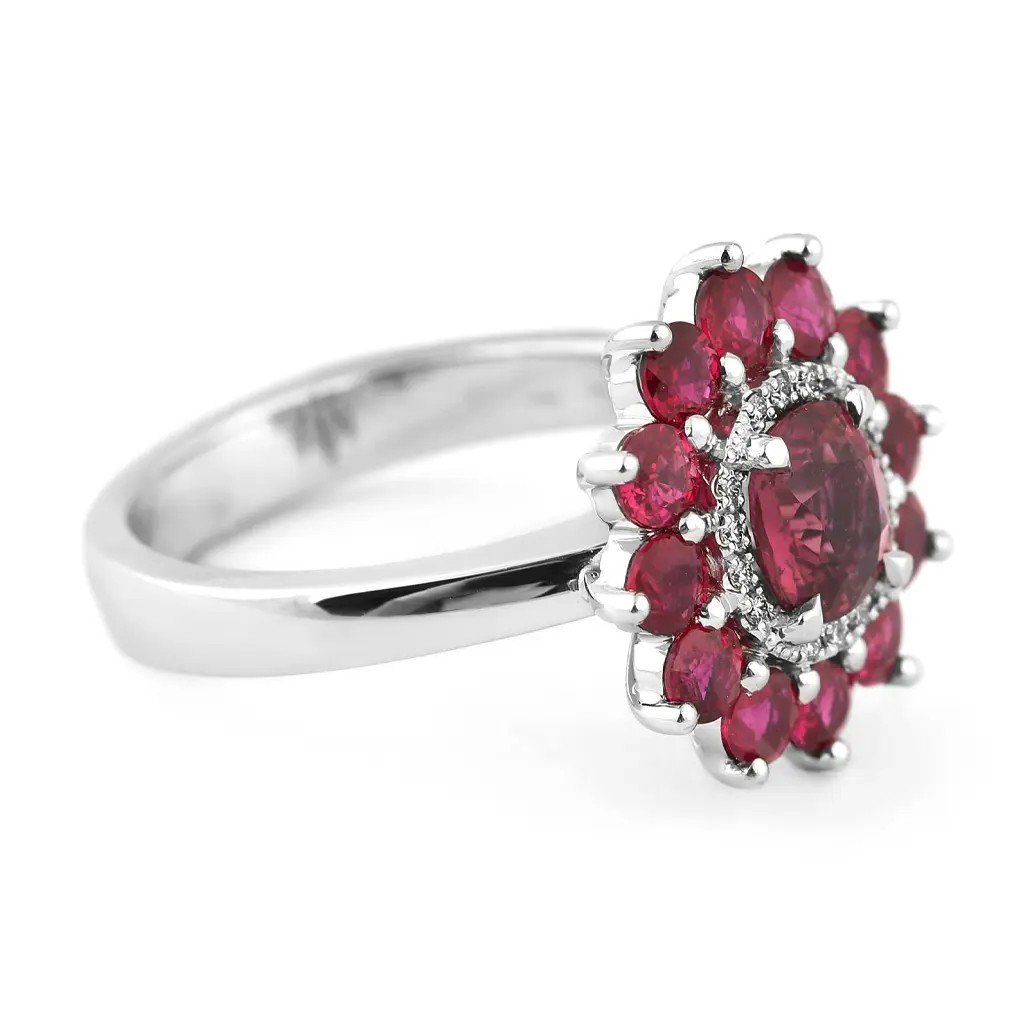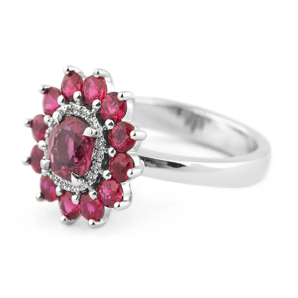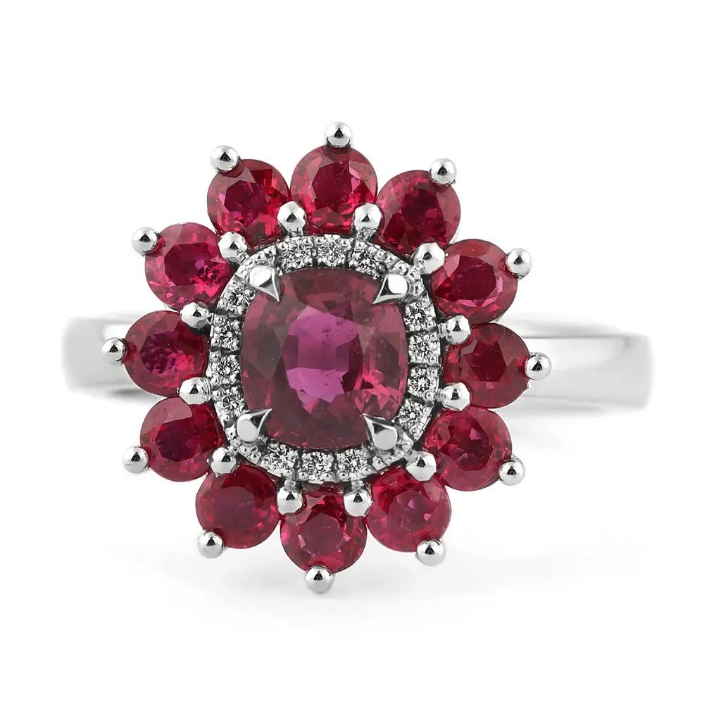 Okouzlující prsten z bílého zlata s rubíny a diamanty, který spojuje luxus, eleganci a nadčasovou krásu – ideální jako výjimečný dárek.