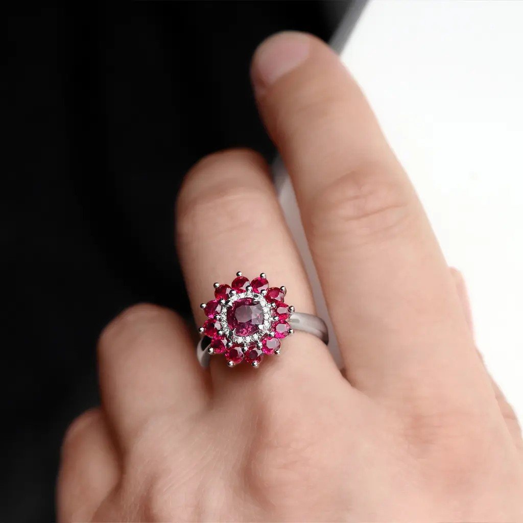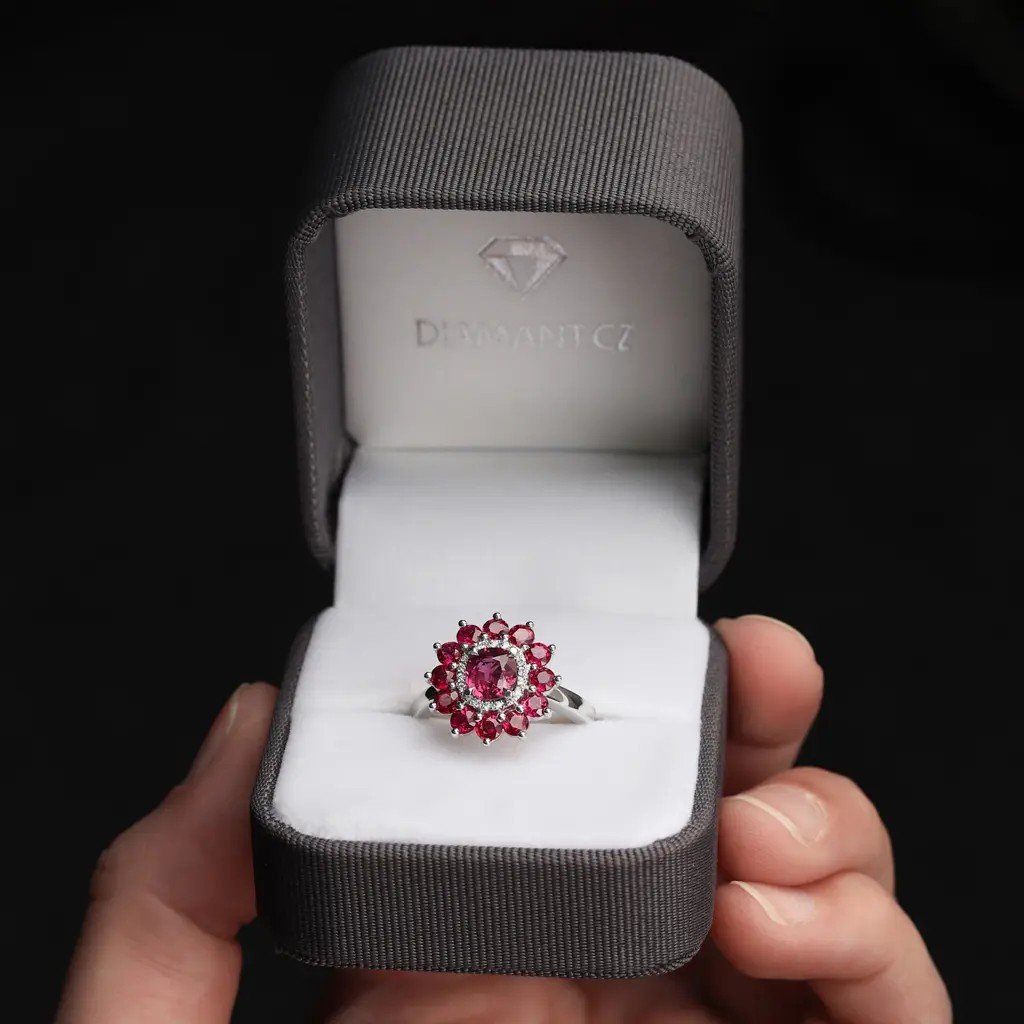 Prsten z bílého zlata ve tvaru květu s přírodními rubíny a diamanty, vel. 55