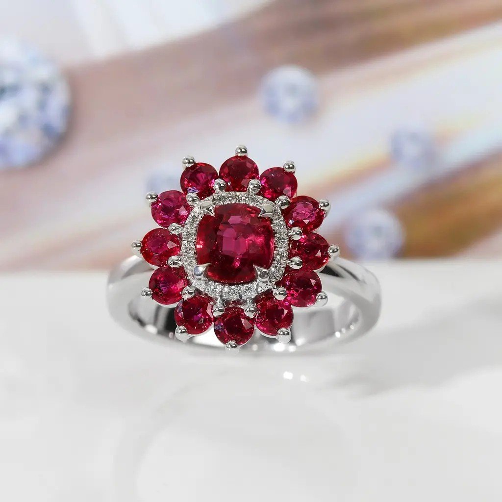 Okolo centrálního kamene je zasazeno dvanáct menších kulatých kombinovaných rubínů, červených a transparentních, každý o průměru 2,95 mm a celkové hmotnosti 1,596 karátu, které byly jemně tepelně upraveny (TE) pro zvýraznění syté barvy. Šperk dále zdobí čtrnáct malých kulatých briliantů, vzácně bílých (F–G–H) s čistotou VS, o průměru 0,95 mm a celkové hmotnosti 0,054 karátu, které dodávají prstenu jemný třpyt a sofistikovanou noblesu.
